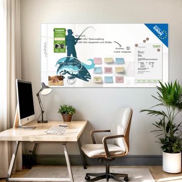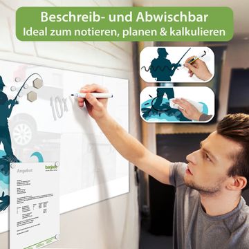Material: 4mm Sicherheitsglas mit Metallrückwand Eigenschaften: beschreibbar, magnetisch, kratzfest Maße: 100x50x0,6cm, 7,50kg schwer Motiv Nummer 13195 Der Angler Zubehör: inklusive 4 Neodym-Magnete