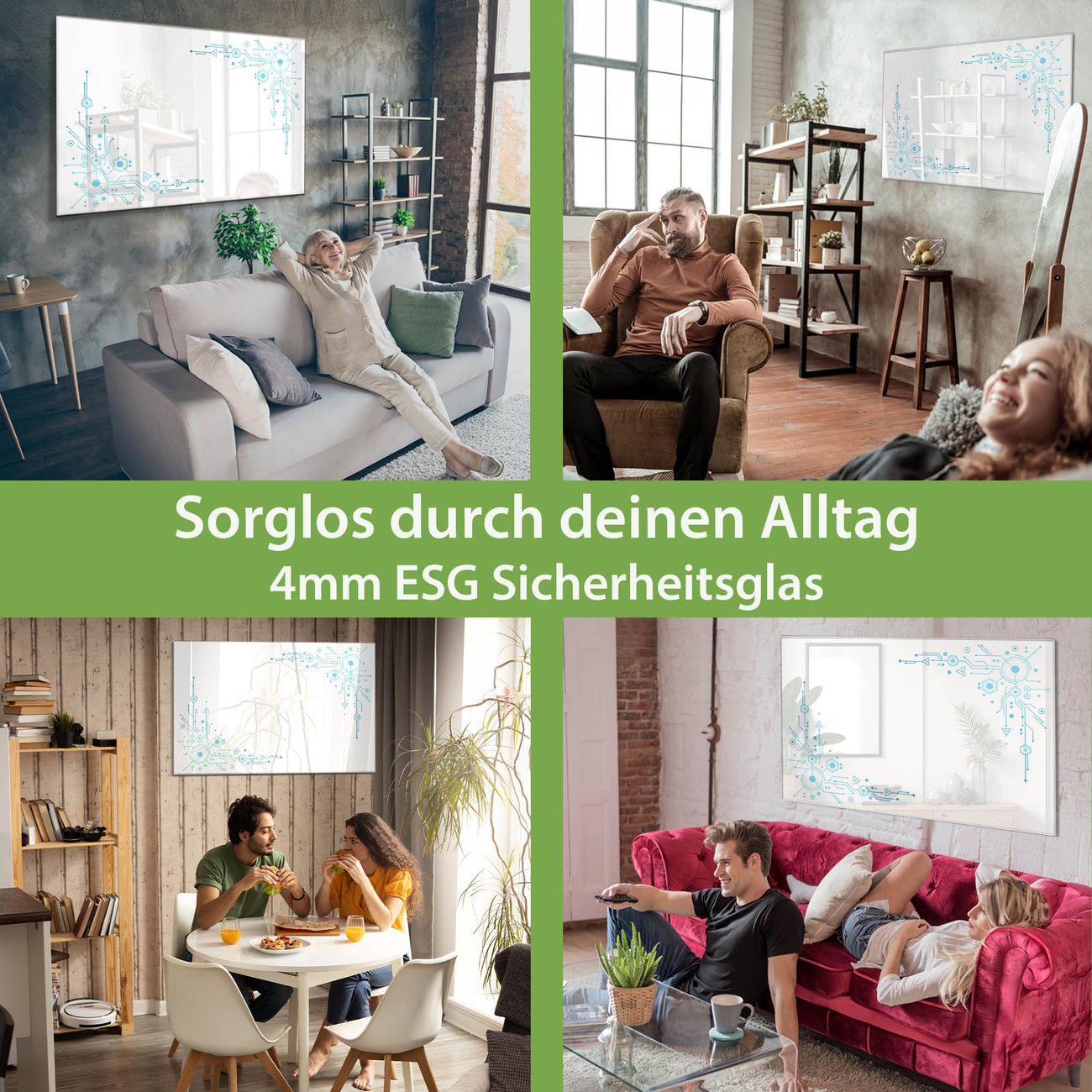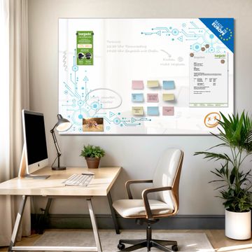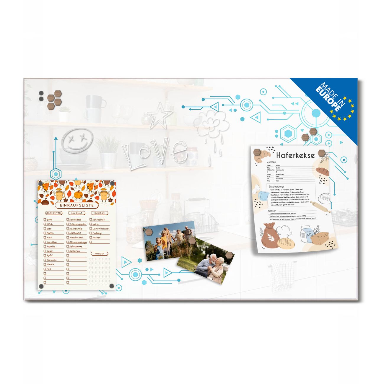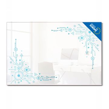 Material: 4mm Sicherheitsglas mit Metallrückwand Eigenschaften: beschreibbar, magnetisch, kratzfest Maße: 75x50x0,6cm, 5,63kg schwer Motiv Nummer 13133 Digitales Netzwerk Zubehör: inklusive 4 Neodym-Magnete