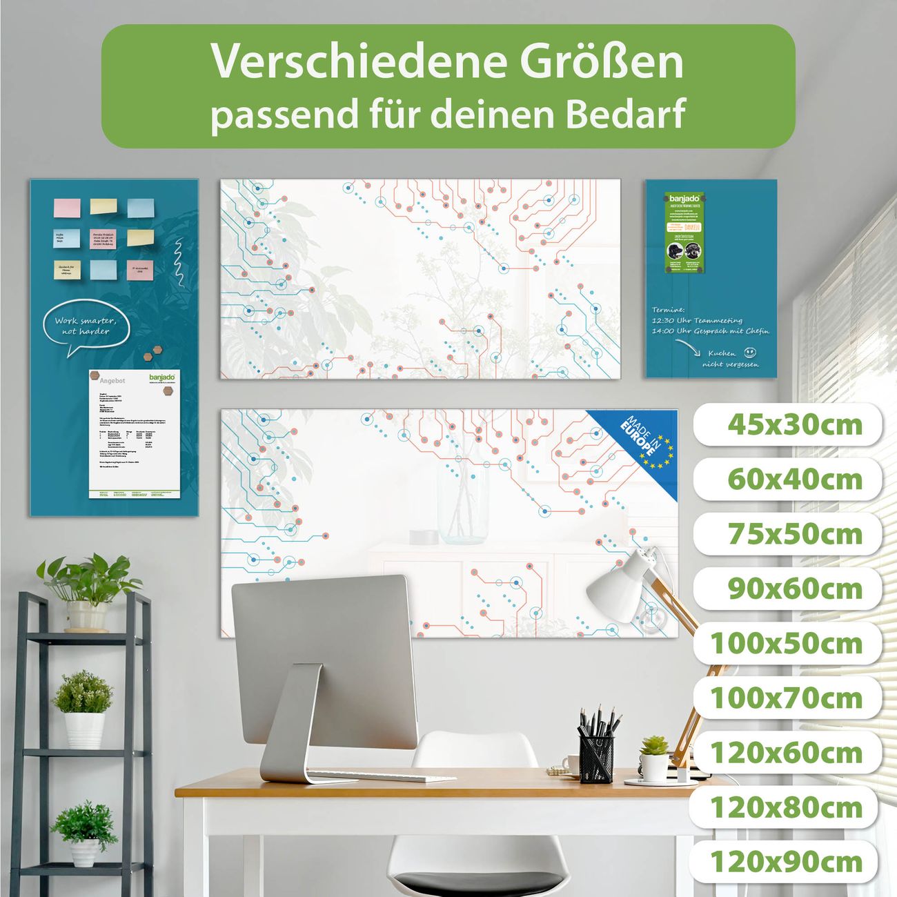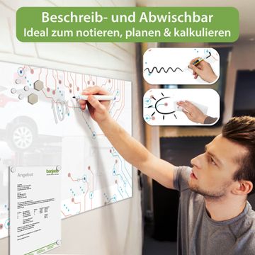 Material: 4mm Sicherheitsglas mit Metallrückwand Eigenschaften: beschreibbar, magnetisch, kratzfest Maße: 100x50x0,6cm, 7,50kg schwer Motiv Nummer 13135 Digitales Schaltkreismuster Zubehör: inklusive 4 Neodym-Magnete