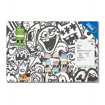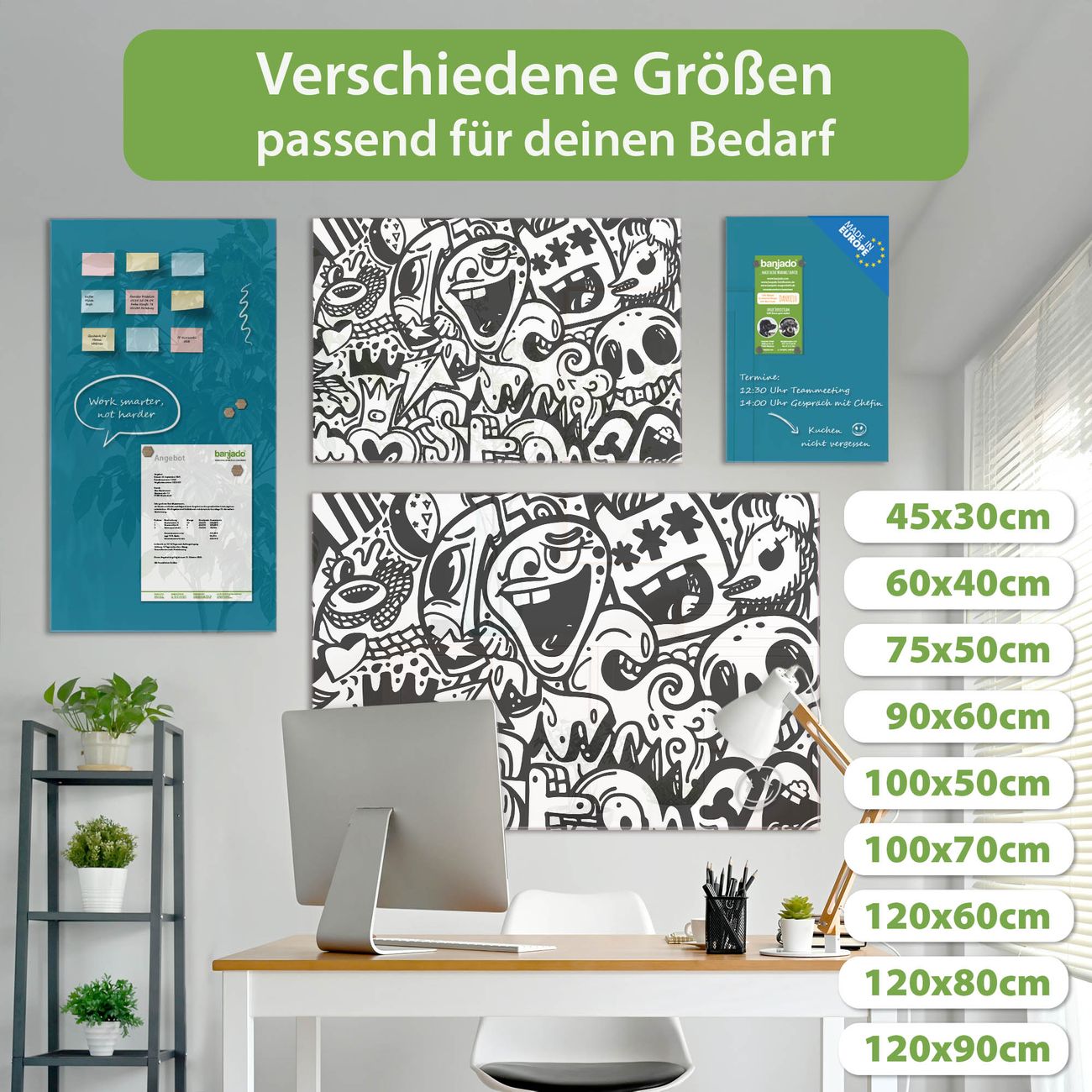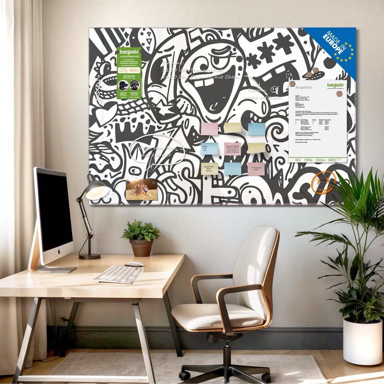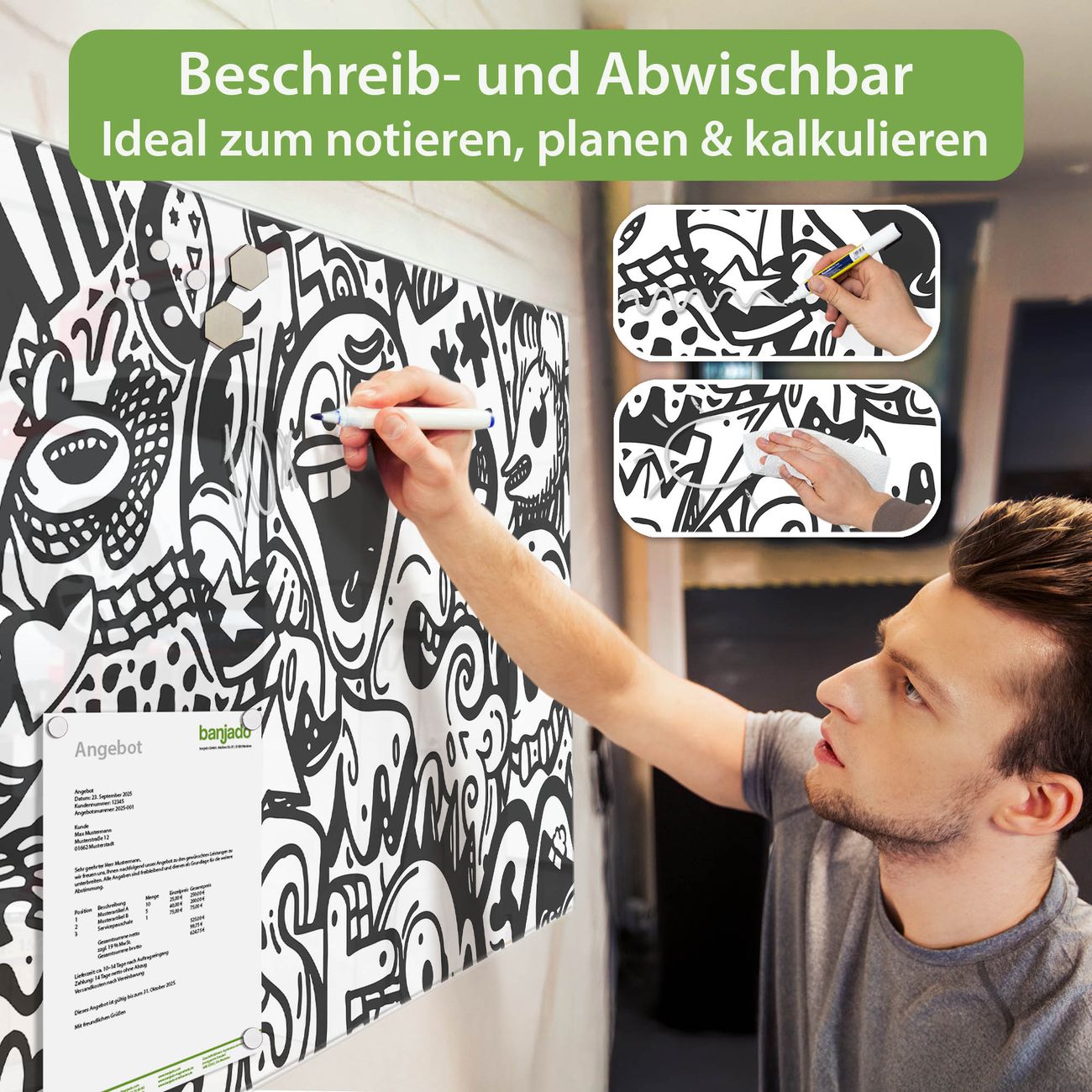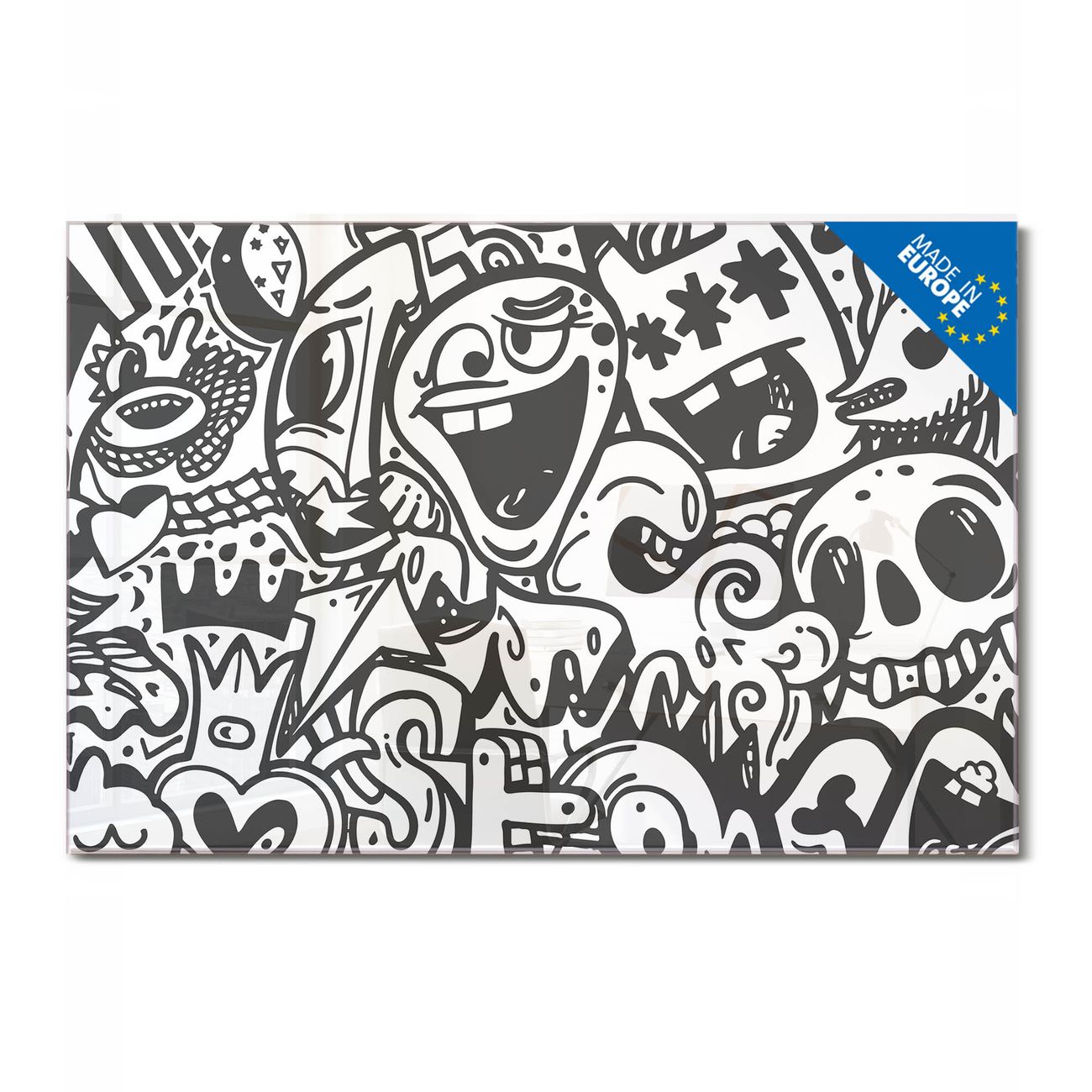Material: 4mm Sicherheitsglas mit Metallrückwand Eigenschaften: beschreibbar, magnetisch, kratzfest Maße: 120x80x0,6cm, 14,40kg schwer Motiv Nummer 13351 Doodle Chaos Zubehör: inklusive 4 Neodym-Magnete