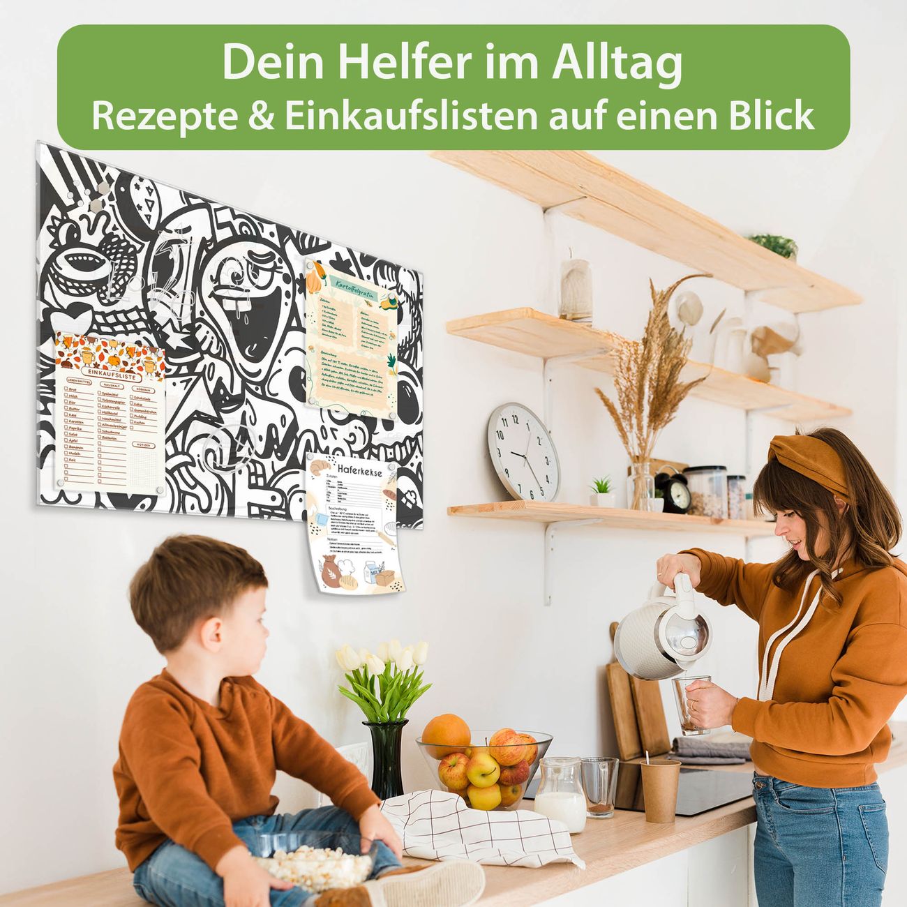 Ein Stück Design, das Ihren Alltag organisiert. Schreiben, heften, inspirieren - alles an einem Ort. Qualität, die man spürt. Montage leicht gemacht. Handwerk mit Herz - veredelt in Sachsen. Einzigartiges Design mit Motiv Motiv Doodle Chaos Beschreibbare Glasoberfläche, leicht zu reinigen Starke Magnetkraft durch Stahlrückwand Inklusive 4 Neodym-Magneten Flexible Montageoptionen Handveredelt in Sachsen - Qualität, die bleibt