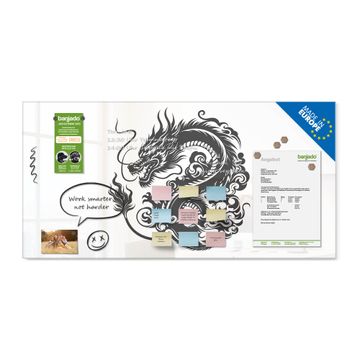 Material: 4mm Sicherheitsglas mit Metallrückwand Eigenschaften: beschreibbar, magnetisch, kratzfest Maße: 100x50x0,6cm, 7,50kg schwer Motiv Nummer 13480 Drachenkunst Zubehör: inklusive 4 Neodym-Magnete