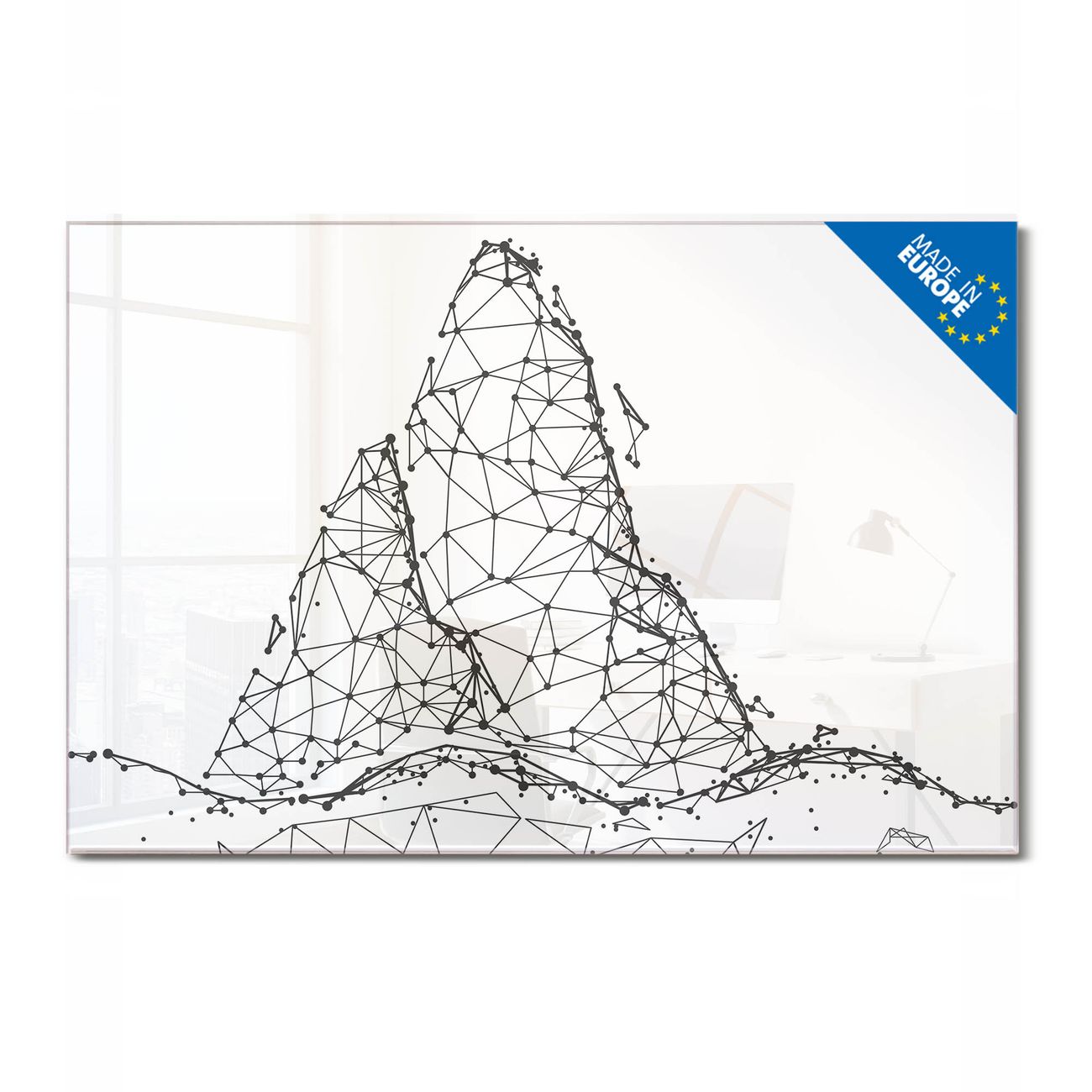 Material: 4mm Sicherheitsglas mit Metallrückwand Eigenschaften: beschreibbar, magnetisch, kratzfest Maße: 90x60x0,6cm, 8,10kg schwer Motiv Nummer 13021 Eisberg abstrakt 2 Zubehör: inklusive 4 Neodym-Magnete