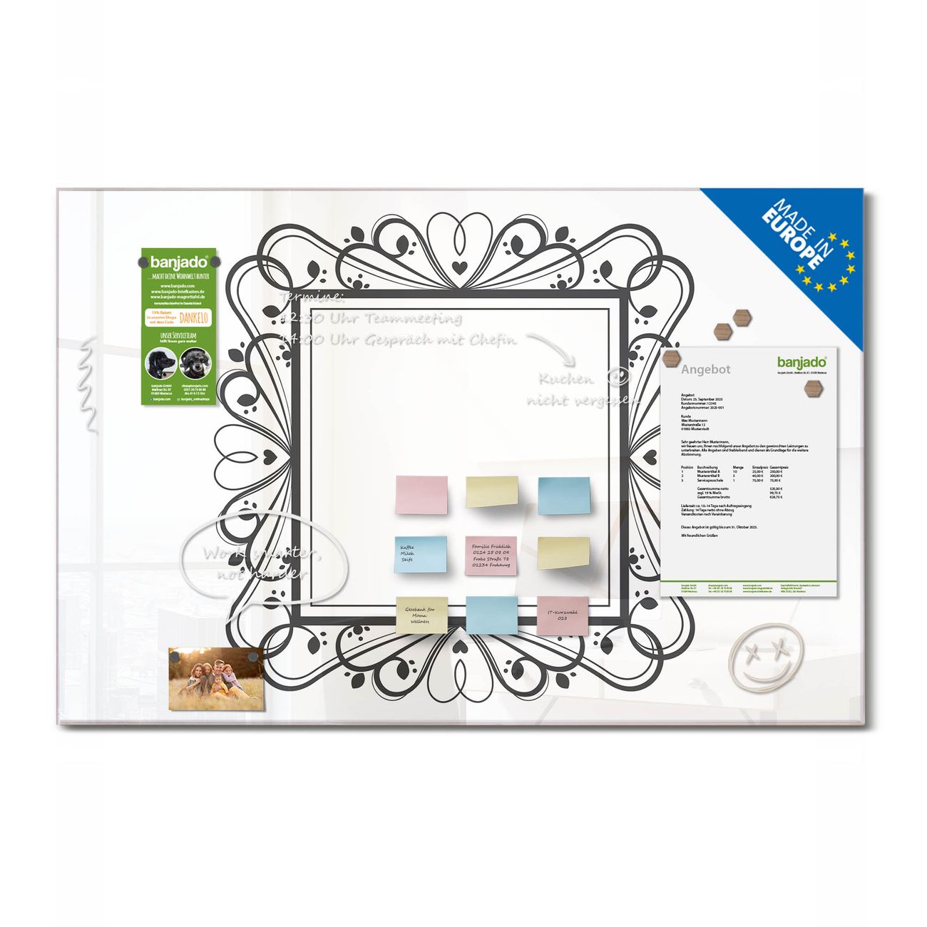 Jede Glas Magnettafel wird in unserer Werkstatt von Hand gefertigt und sorgfältig geprüft. So erhalten Sie ein echtes Qualitätsprodukt, das Funktion und Ästhetik perfekt vereint.?? Warum banjado?