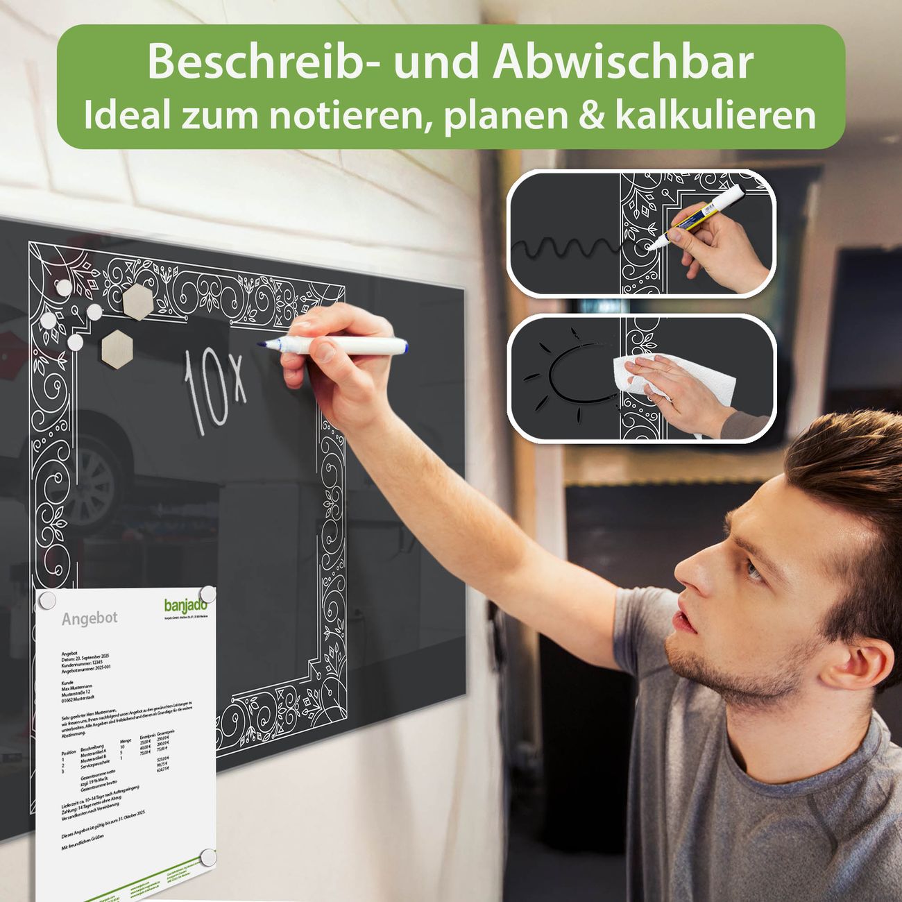 Auf der glatten Glasoberfläche lassen sich Termine, Rezepte oder Notizen ganz einfach mit Kreidestiften festhalten und rückstandslos entfernen. Starke Neodym-Magnete halten Ihre wichtigsten Erinnerungen sicher an Ort und Stelle. So entsteht Ihre ganz persönliche Ideenwand - jeden Tag neu.