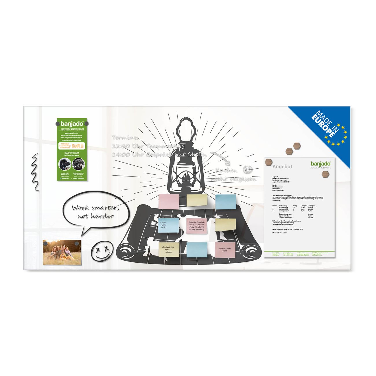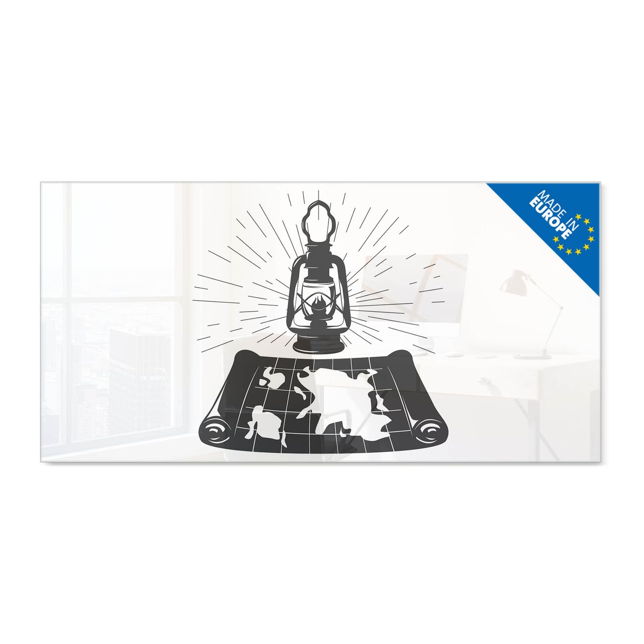 Material: 4mm Sicherheitsglas mit Metallrückwand Eigenschaften: beschreibbar, magnetisch, kratzfest Maße: 100x50x0,6cm, 7,50kg schwer Motiv Nummer 13360 Entdecker-Laterne Zubehör: inklusive 4 Neodym-Magnete