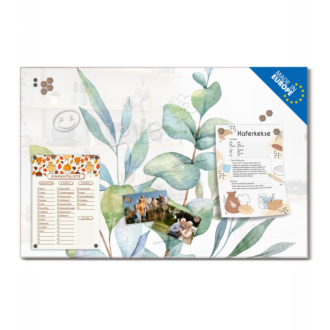 Material: 4mm Sicherheitsglas mit Metallrückwand Eigenschaften: beschreibbar, magnetisch, kratzfest Maße: 75x50x0,6cm, 5,63kg schwer Motiv Nummer 13239 Eukalyptus Aquarell Zubehör: inklusive 4 Neodym-Magnete