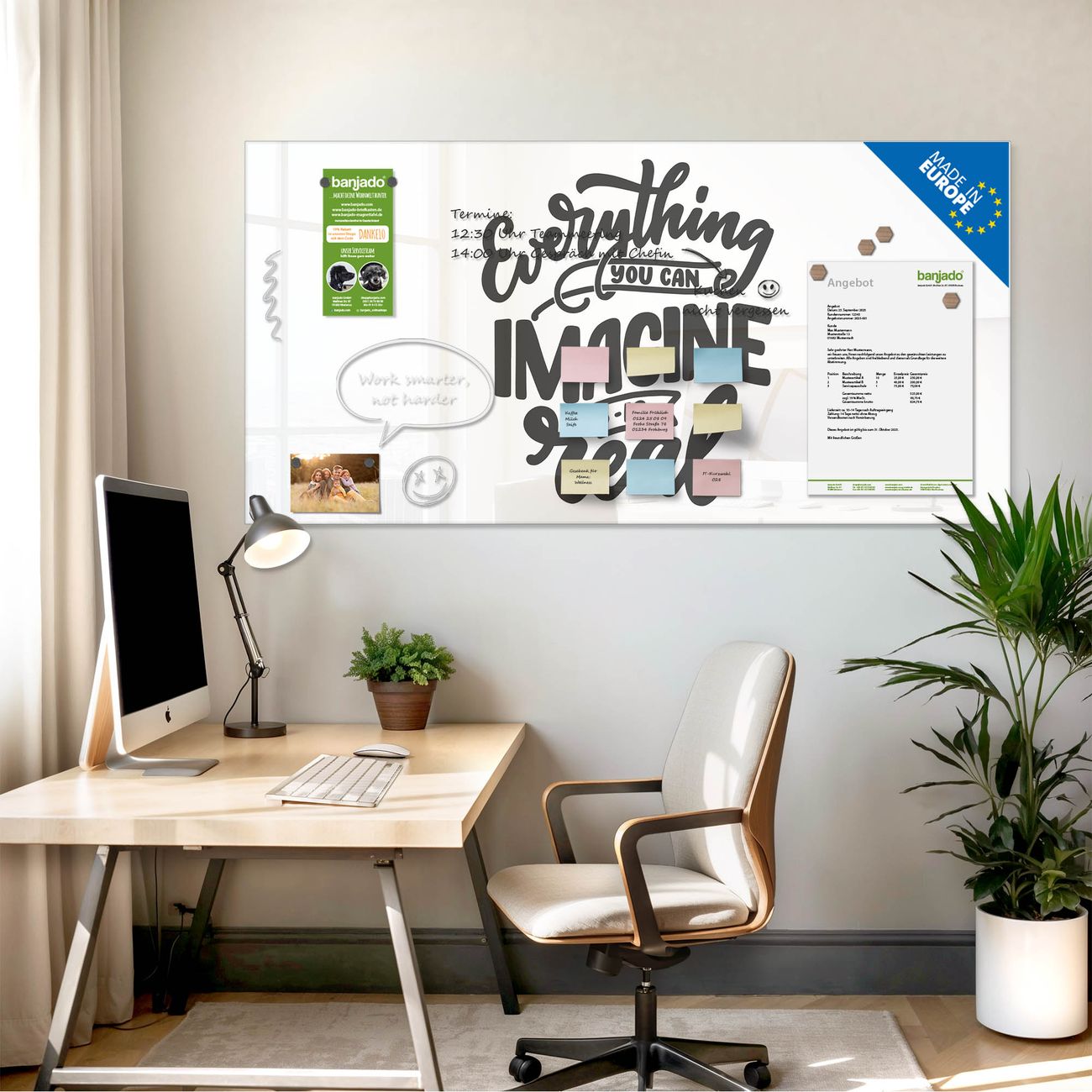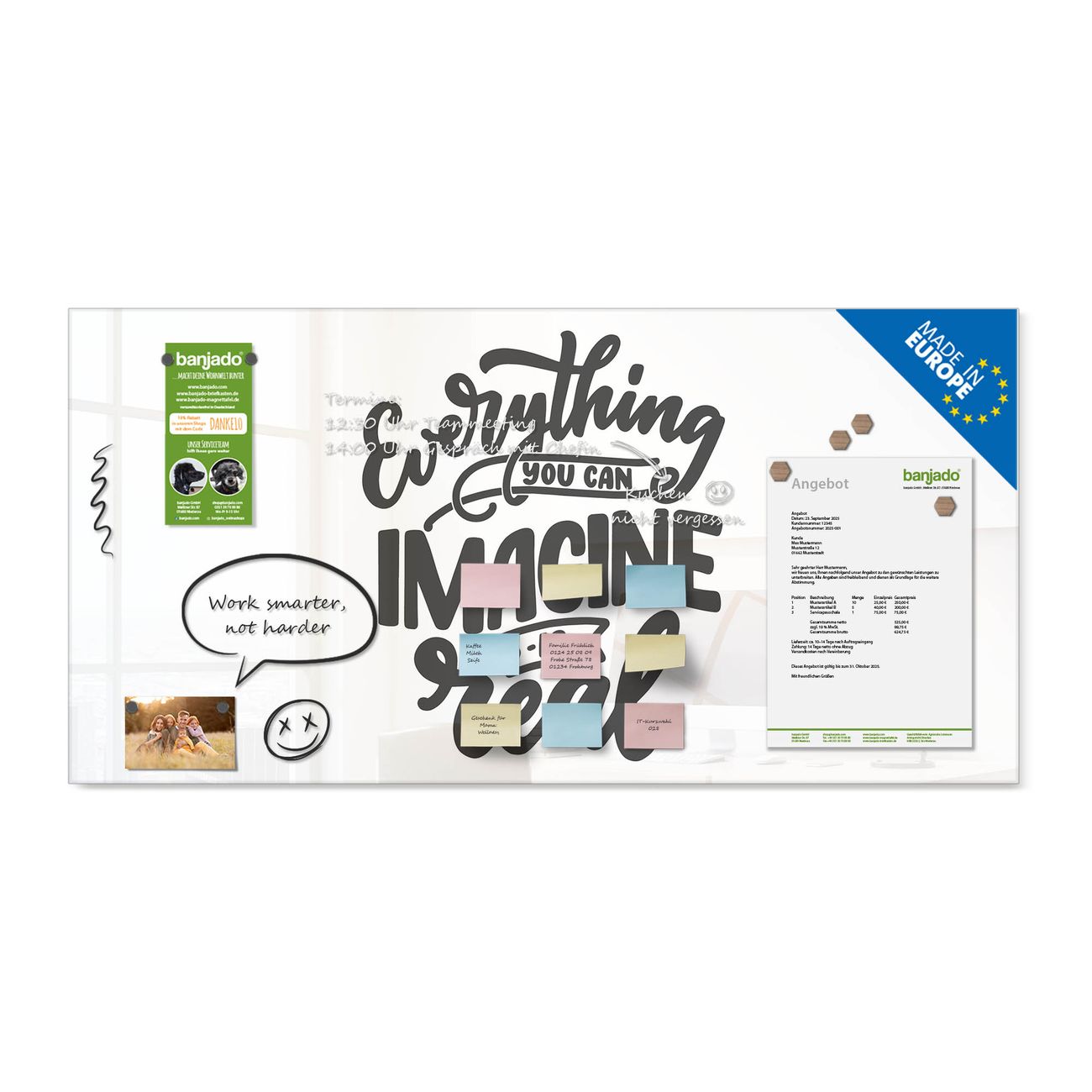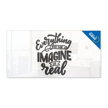 Material: 4mm Sicherheitsglas mit Metallrückwand Eigenschaften: beschreibbar, magnetisch, kratzfest Maße: 100x50x0,6cm, 7,50kg schwer Motiv Nummer 13093 Everything you can imagine is real 2 Zubehör: inklusive 4 Neodym-Magnete