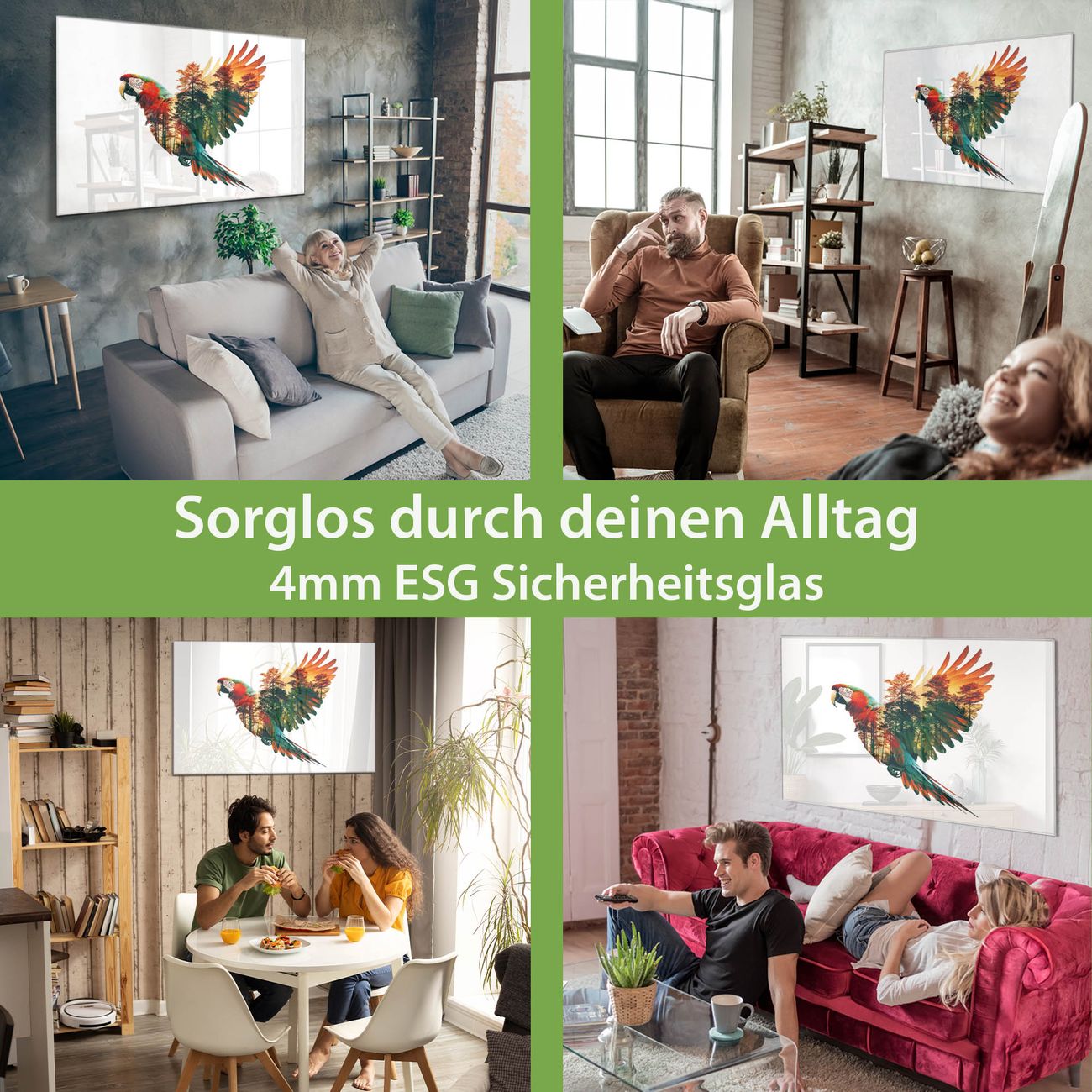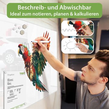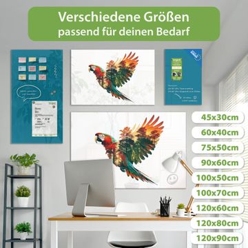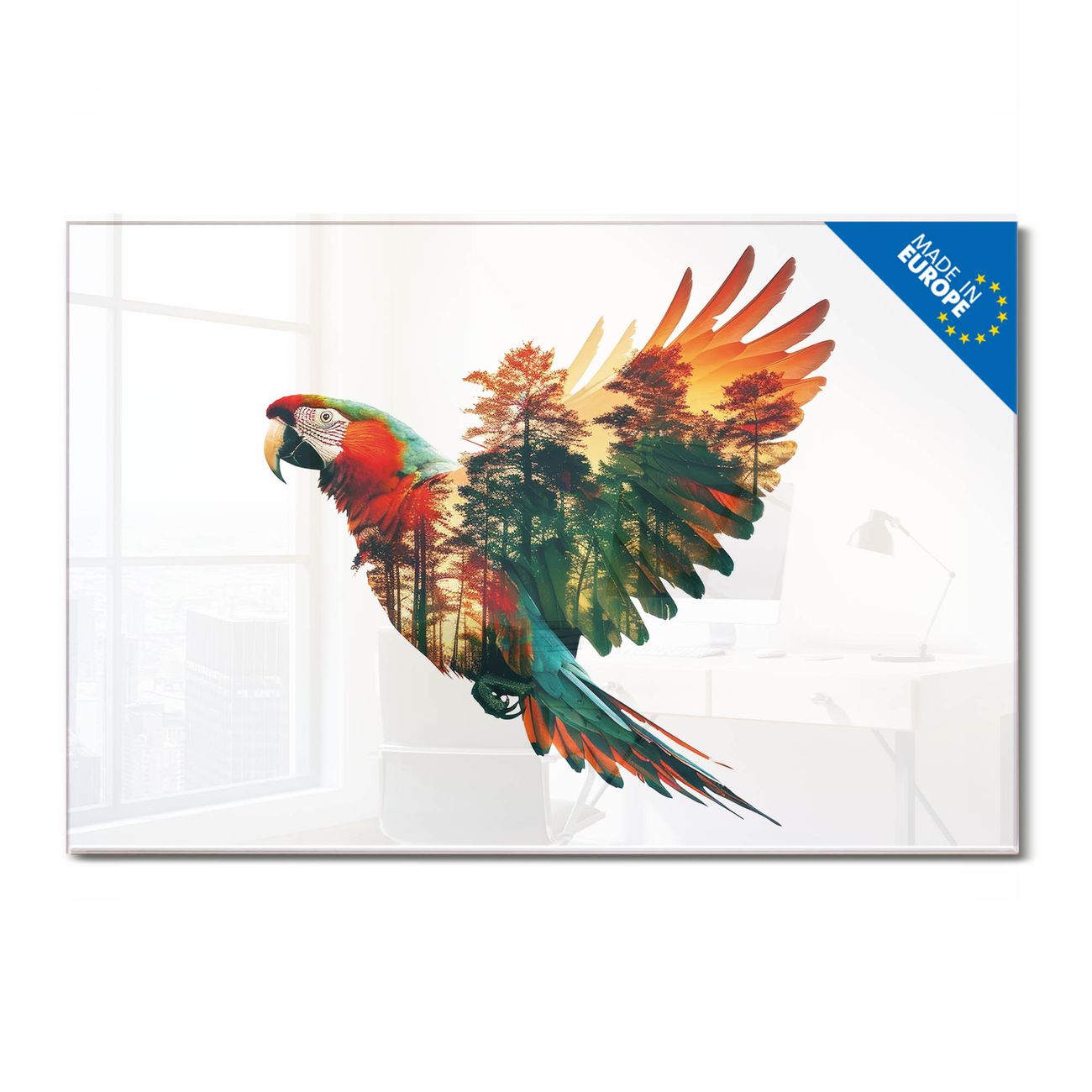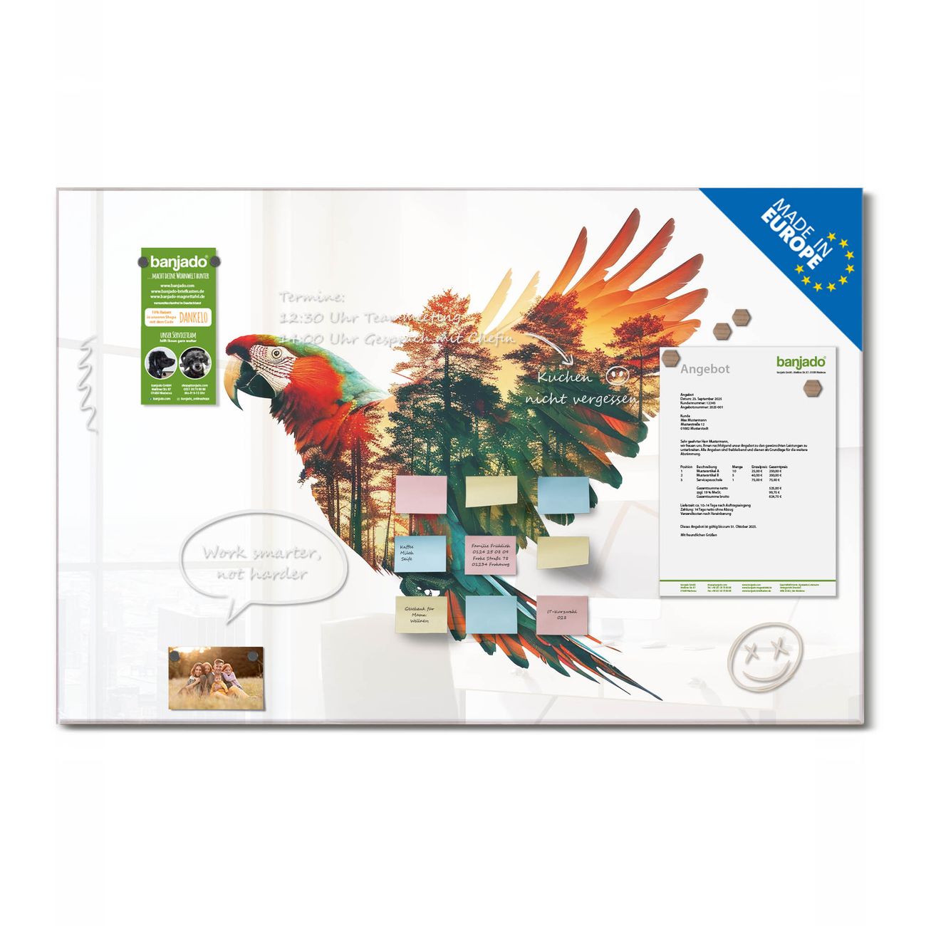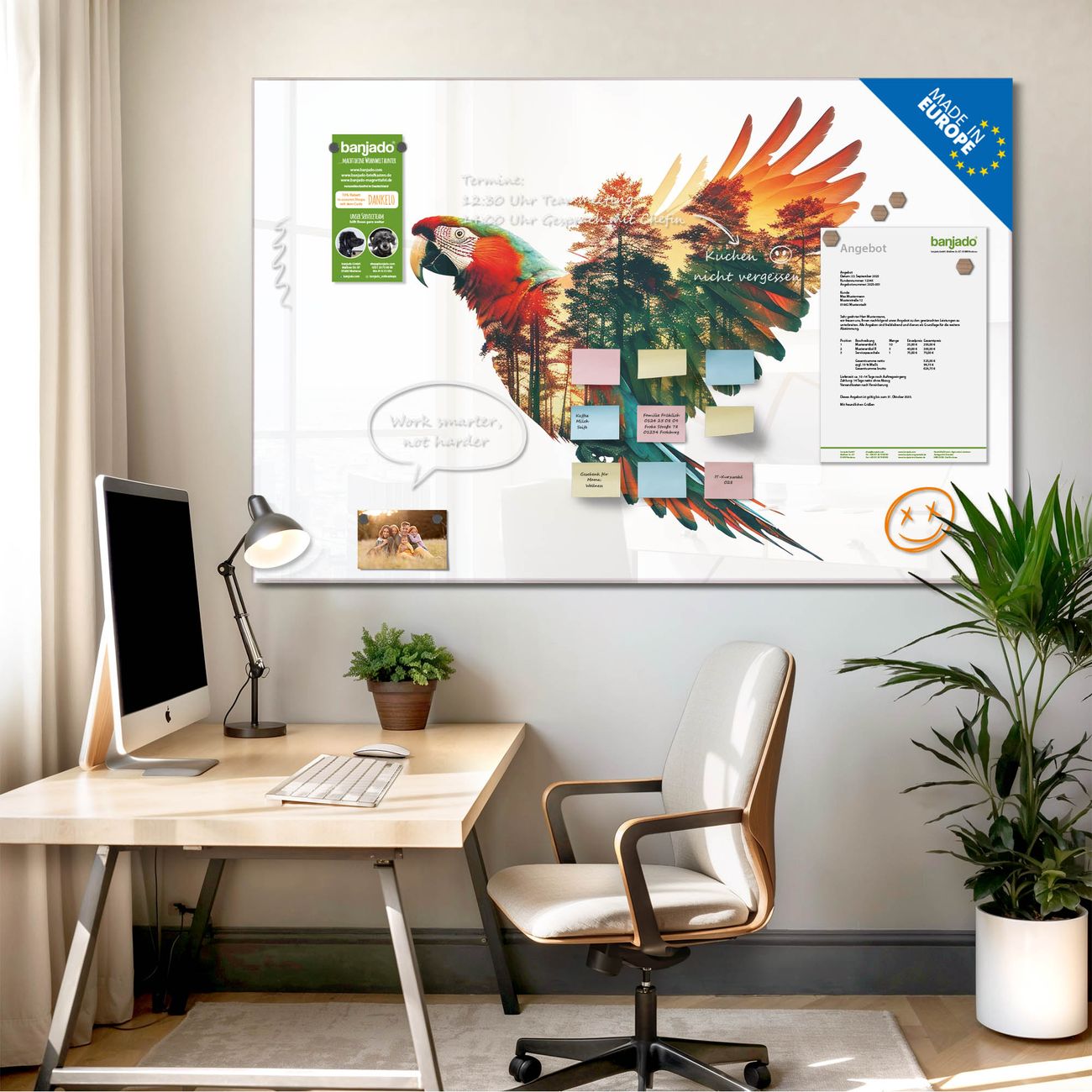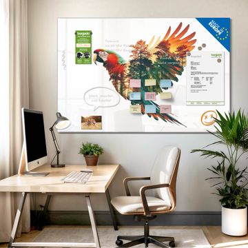Material: 4mm Sicherheitsglas mit Metallrückwand Eigenschaften: beschreibbar, magnetisch, kratzfest Maße: 120x80x0,6cm, 14,40kg schwer Motiv Nummer 13468 Exotischer Freiheit Zubehör: inklusive 4 Neodym-Magnete