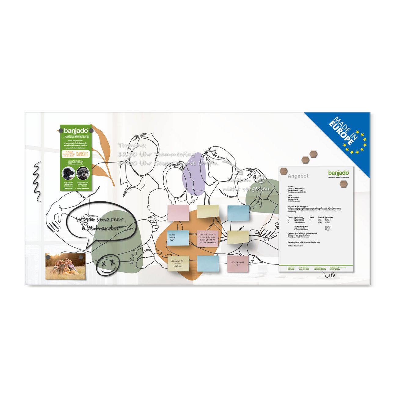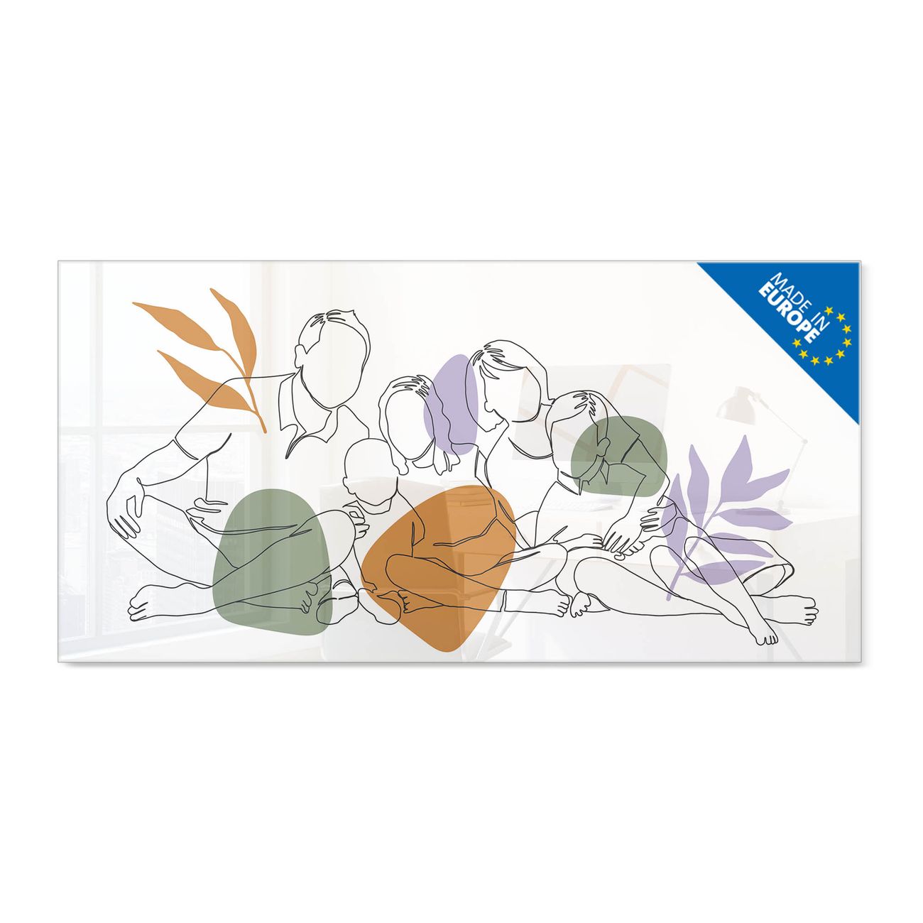 Material: 4mm Sicherheitsglas mit Metallrückwand Eigenschaften: beschreibbar, magnetisch, kratzfest Maße: 100x50x0,6cm, 7,50kg schwer Motiv Nummer 13297 Familienbande Zubehör: inklusive 4 Neodym-Magnete