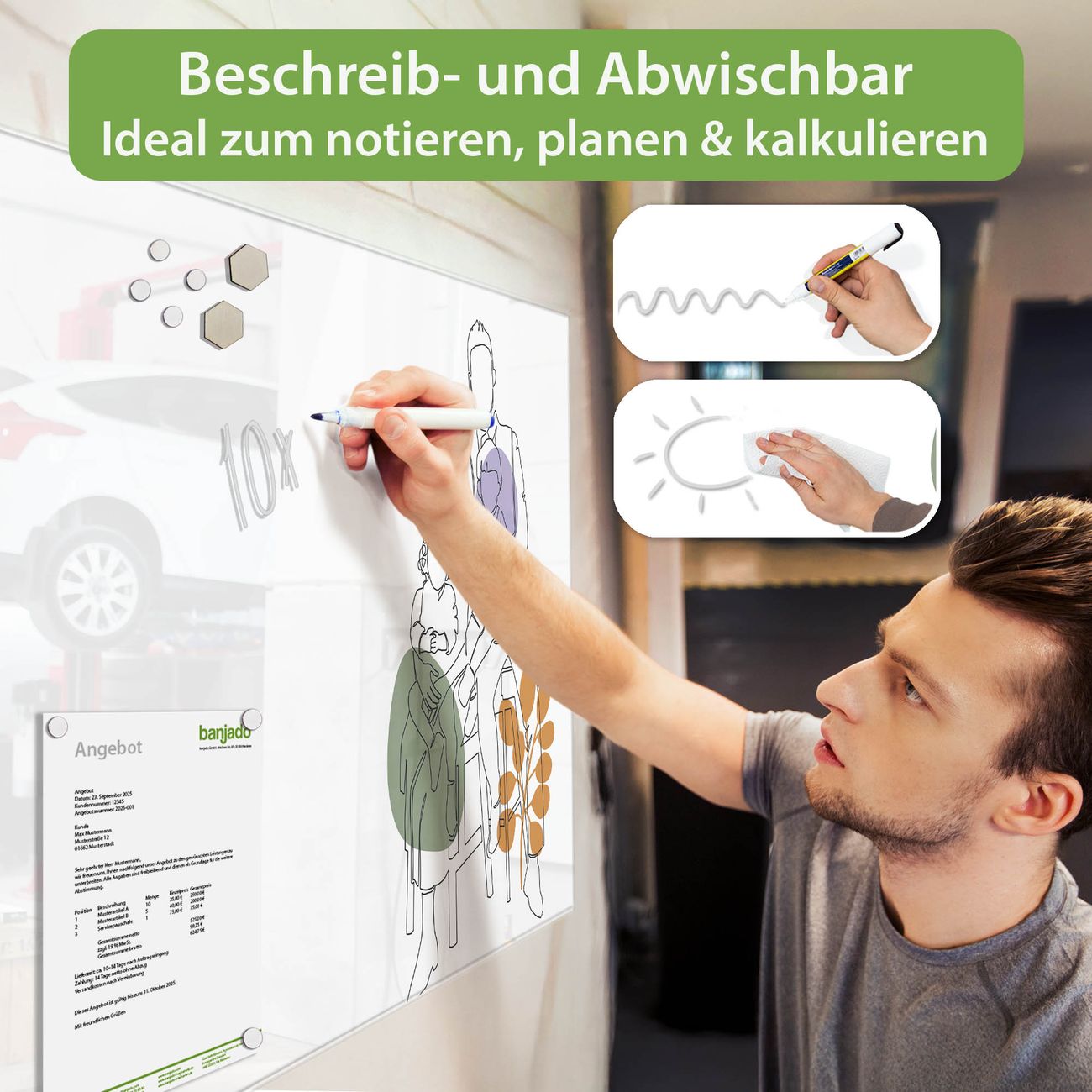 Jede Glas Magnettafel wird in unserer Werkstatt von Hand gefertigt und sorgfältig geprüft. So erhalten Sie ein echtes Qualitätsprodukt, das Funktion und Ästhetik perfekt vereint.?? Warum banjado?