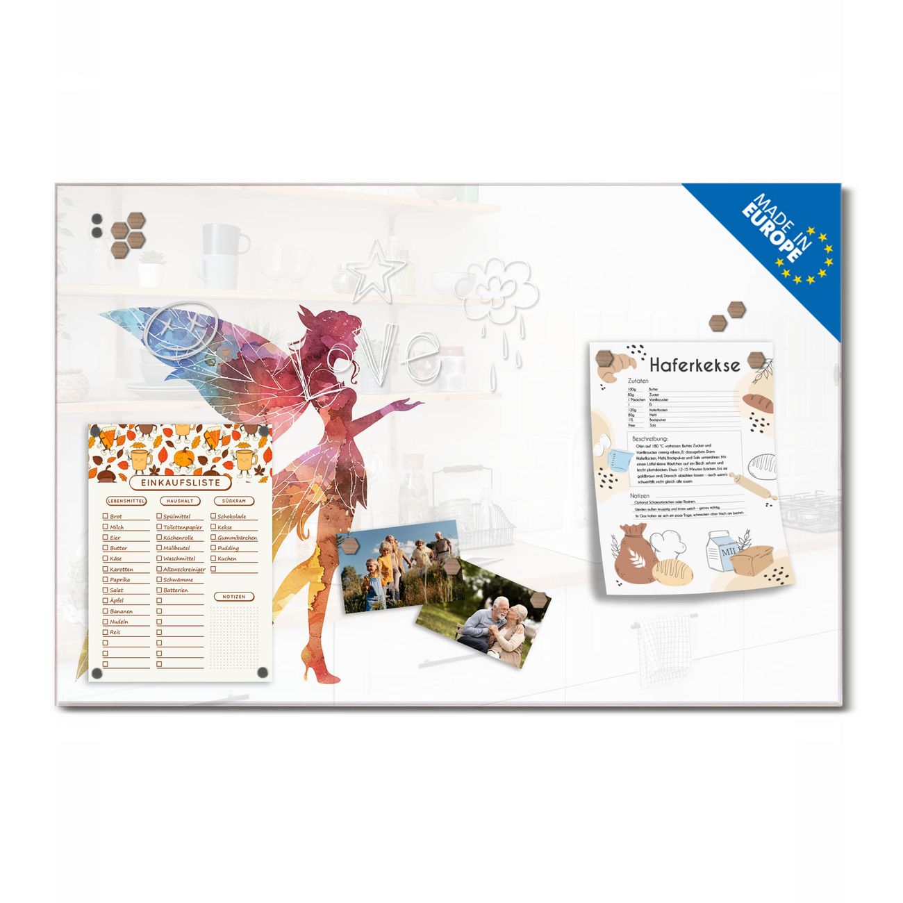 Ein Stück Design, das Ihren Alltag organisiert. Schreiben, heften, inspirieren - alles an einem Ort. Qualität, die man spürt. Montage leicht gemacht. Handwerk mit Herz - veredelt in Sachsen. Einzigartiges Design mit Motiv Motiv Fantasievolle Fee Beschreibbare Glasoberfläche, leicht zu reinigen Starke Magnetkraft durch Stahlrückwand Inklusive 4 Neodym-Magneten Flexible Montageoptionen Handveredelt in Sachsen - Qualität, die bleibt