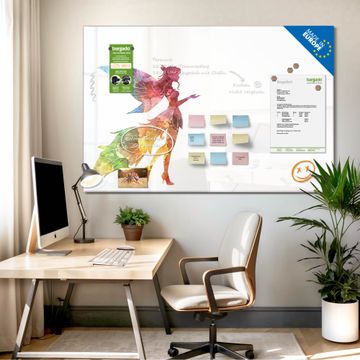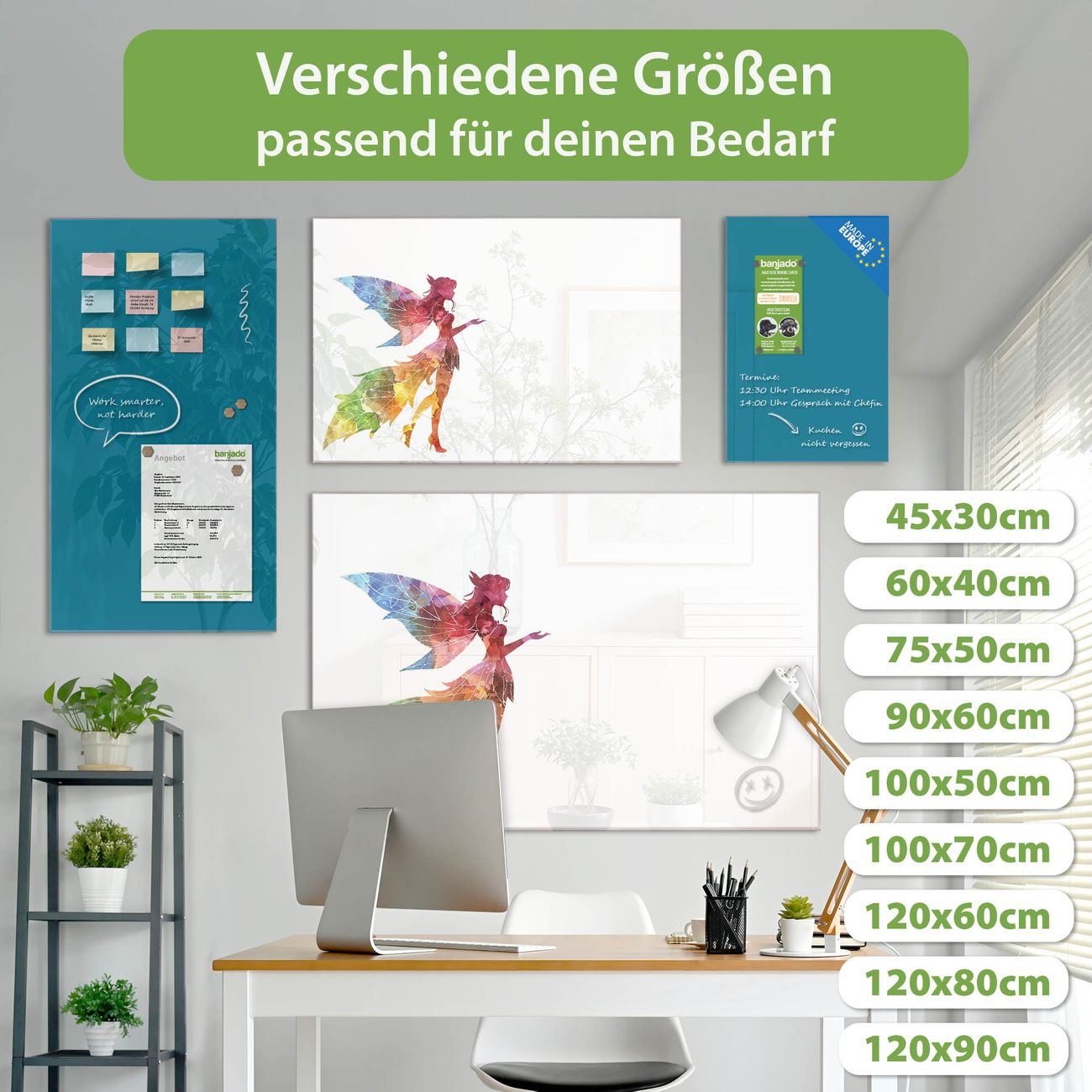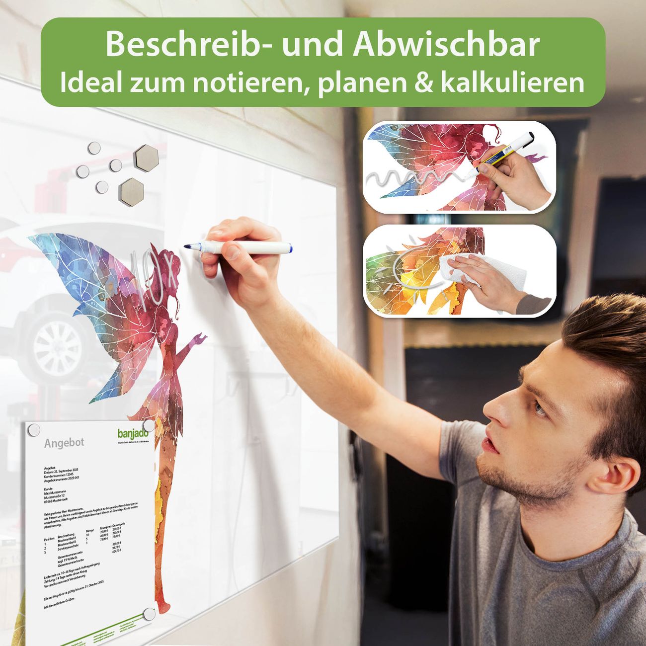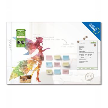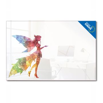 Material: 4mm Sicherheitsglas mit Metallrückwand Eigenschaften: beschreibbar, magnetisch, kratzfest Maße: 120x80x0,6cm, 14,40kg schwer Motiv Nummer 13263 Fantasievolle Fee Zubehör: inklusive 4 Neodym-Magnete