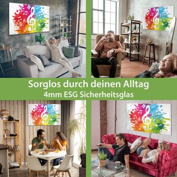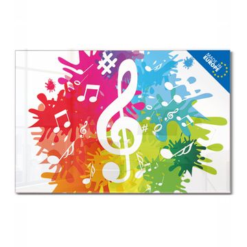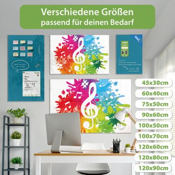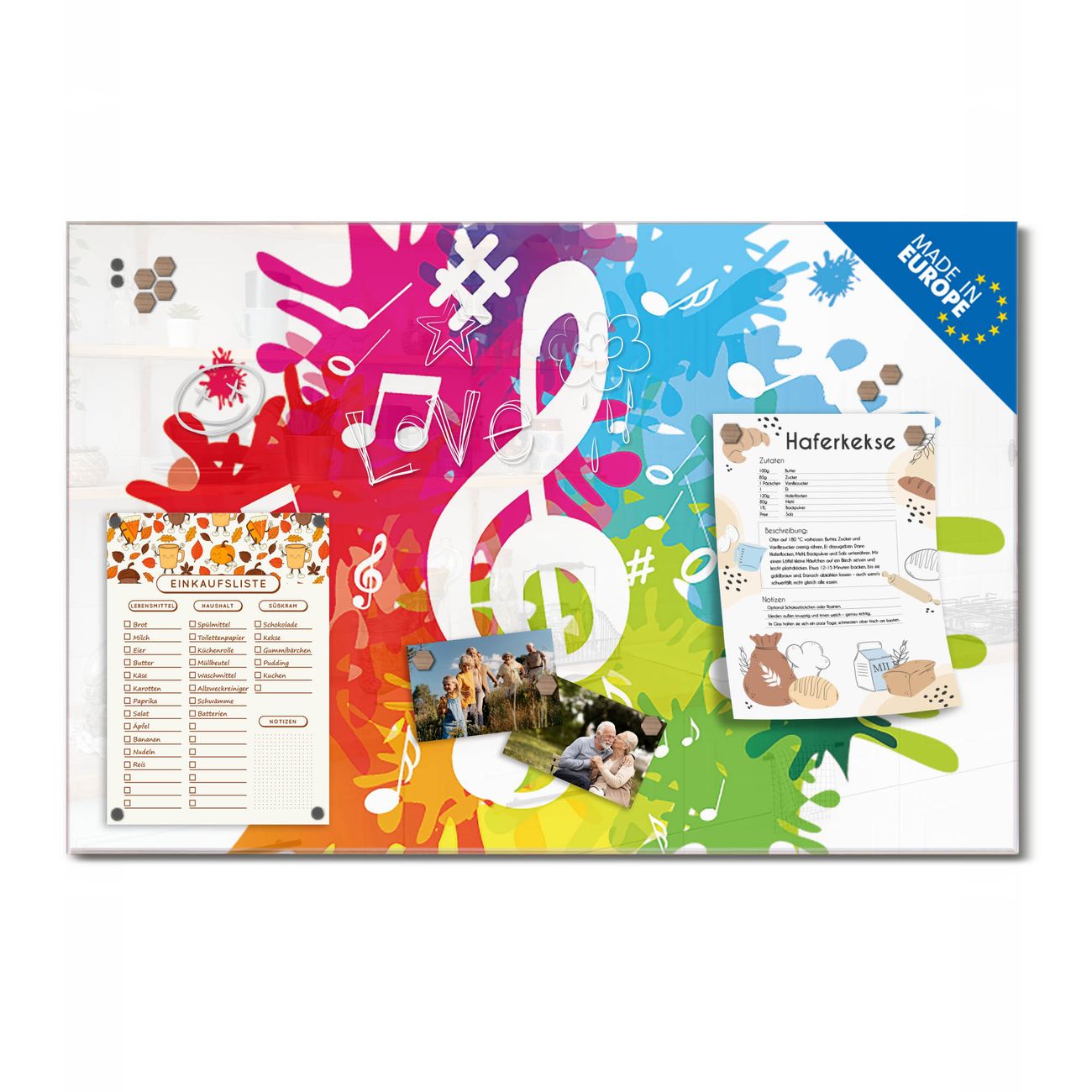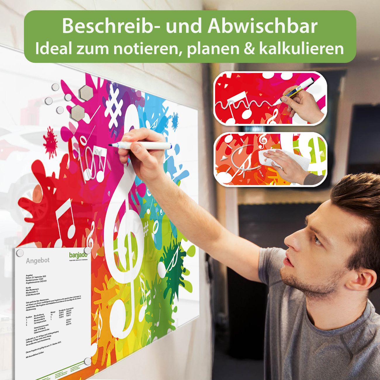 Material: 4mm Sicherheitsglas mit Metallrückwand Eigenschaften: beschreibbar, magnetisch, kratzfest Maße: 75x50x0,6cm, 5,63kg schwer Motiv Nummer 13324 Farbensymphonie Zubehör: inklusive 4 Neodym-Magnete