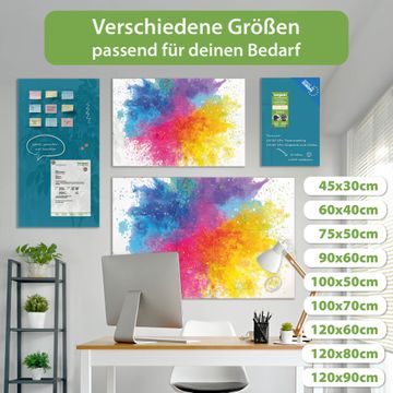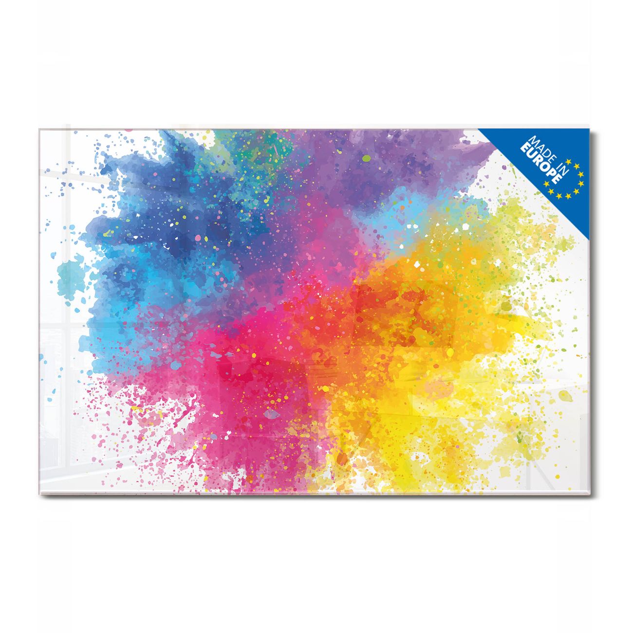 Material: 4mm Sicherheitsglas mit Metallrückwand Eigenschaften: beschreibbar, magnetisch, kratzfest Maße: 90x60x0,6cm, 8,10kg schwer Motiv Nummer 13325 Farbexplosion 2 Zubehör: inklusive 4 Neodym-Magnete