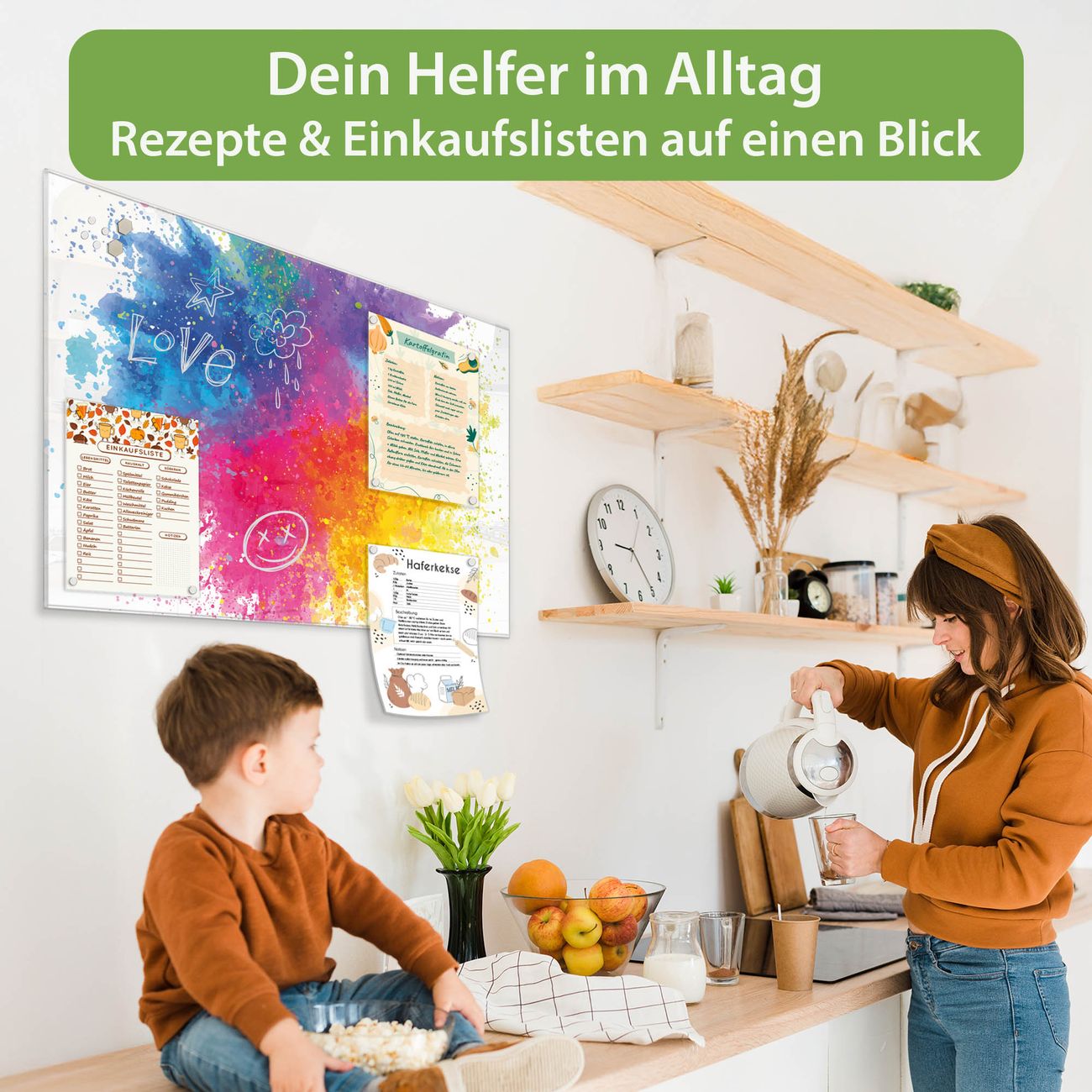 Ein Stück Design, das Ihren Alltag organisiert. Schreiben, heften, inspirieren - alles an einem Ort. Qualität, die man spürt. Montage leicht gemacht. Handwerk mit Herz - veredelt in Sachsen. Einzigartiges Design mit Motiv Motiv Farbexplosion 2 Beschreibbare Glasoberfläche, leicht zu reinigen Starke Magnetkraft durch Stahlrückwand Inklusive 4 Neodym-Magneten Flexible Montageoptionen Handveredelt in Sachsen - Qualität, die bleibt