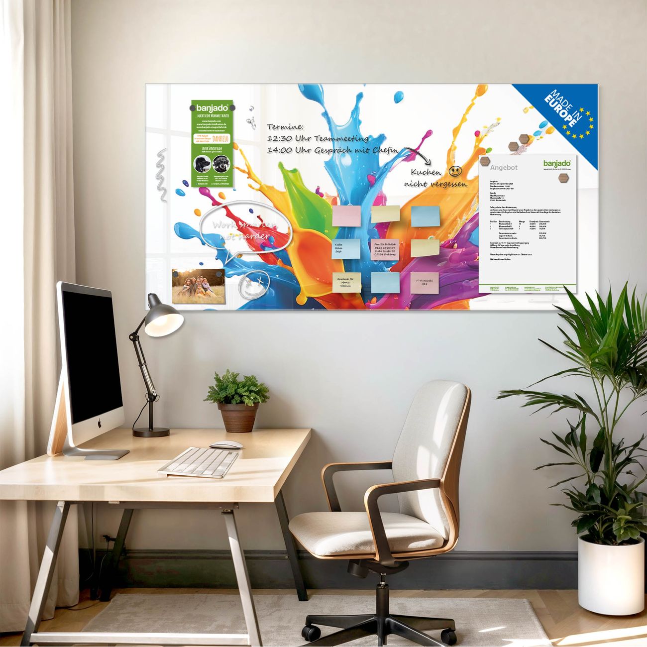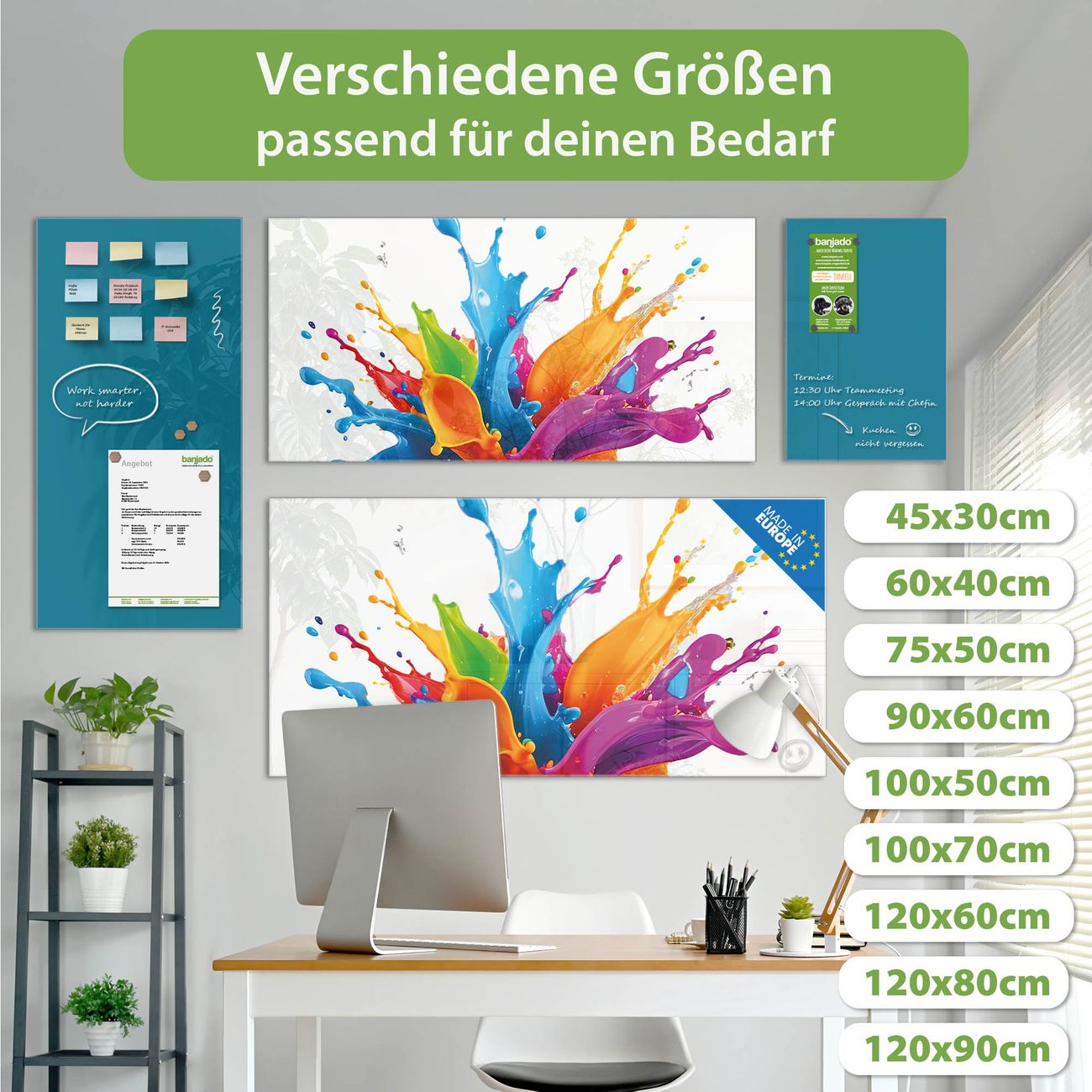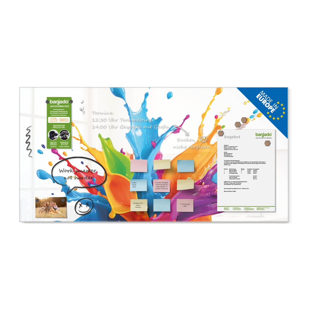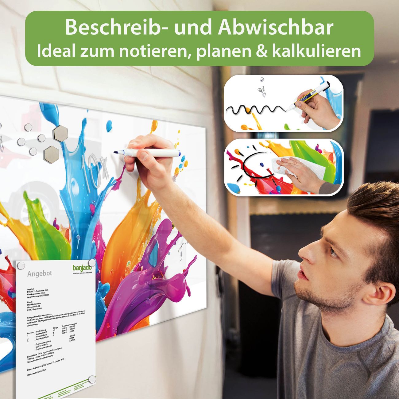 Material: 4mm Sicherheitsglas mit Metallrückwand Eigenschaften: beschreibbar, magnetisch, kratzfest Maße: 100x50x0,6cm, 7,50kg schwer Motiv Nummer 13326 Farbspritzer-Explosion Zubehör: inklusive 4 Neodym-Magnete