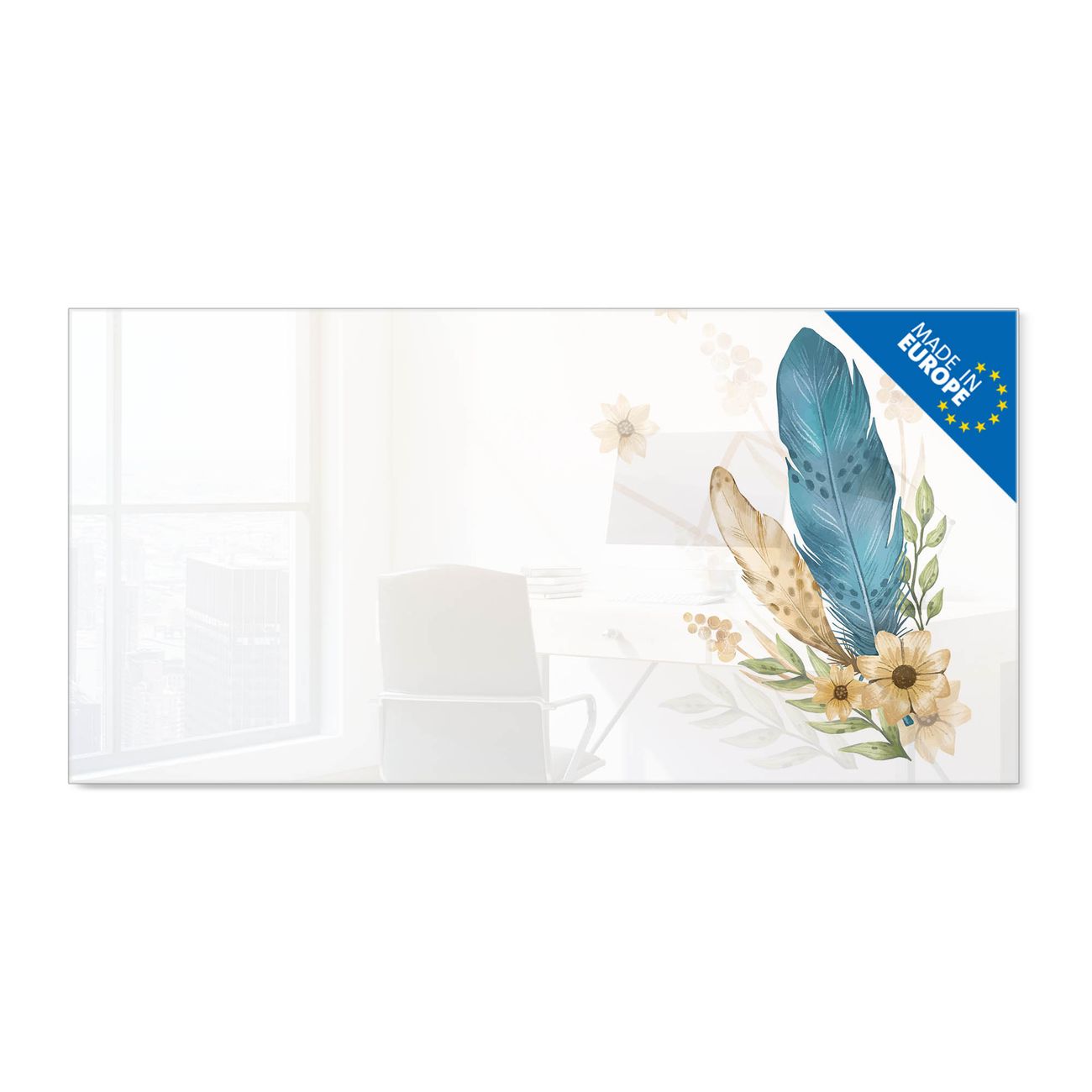 Material: 4mm Sicherheitsglas mit Metallrückwand Eigenschaften: beschreibbar, magnetisch, kratzfest Maße: 100x50x0,6cm, 7,50kg schwer Motiv Nummer 13156 Federn und Blüten Zubehör: inklusive 4 Neodym-Magnete