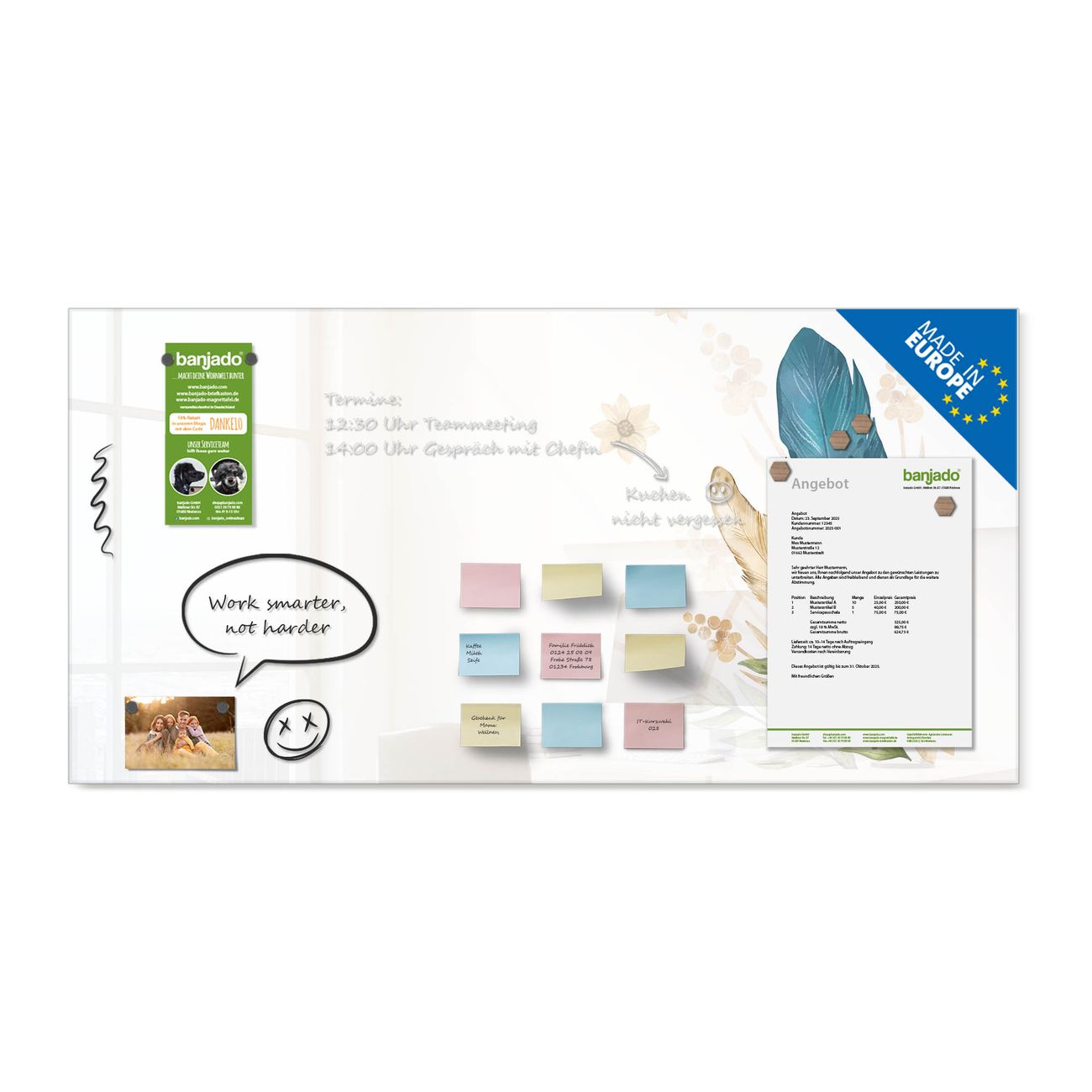 Jede Glas Magnettafel wird in unserer Werkstatt von Hand gefertigt und sorgfältig geprüft. So erhalten Sie ein echtes Qualitätsprodukt, das Funktion und Ästhetik perfekt vereint.?? Warum banjado?