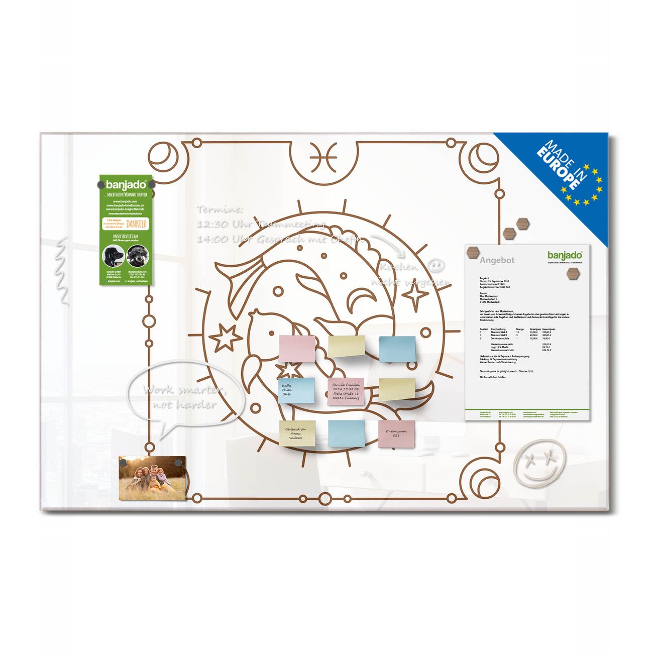 Material: 4mm Sicherheitsglas mit Metallrückwand Eigenschaften: beschreibbar, magnetisch, kratzfest Maße: 120x80x0,6cm, 14,40kg schwer Motiv Nummer 13183 Fische Sternzeichen Illustration Zubehör: inklusive 4 Neodym-Magnete