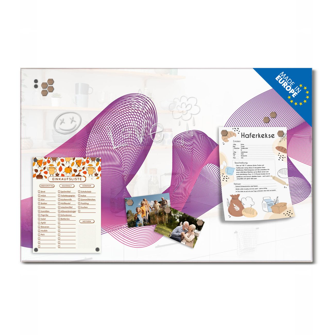 Material: 4mm Sicherheitsglas mit Metallrückwand Eigenschaften: beschreibbar, magnetisch, kratzfest Maße: 75x50x0,6cm, 5,63kg schwer Motiv Nummer 13132 Fließende Kurven Zubehör: inklusive 4 Neodym-Magnete