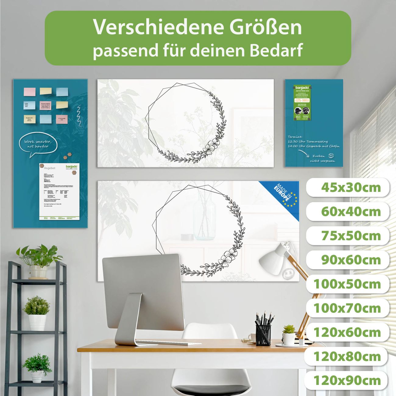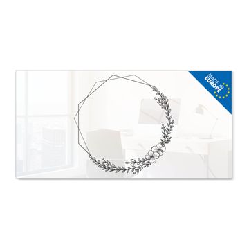 Material: 4mm Sicherheitsglas mit Metallrückwand Eigenschaften: beschreibbar, magnetisch, kratzfest Maße: 100x50x0,6cm, 7,50kg schwer Motiv Nummer 13534 Floral Geometric Frame Zubehör: inklusive 4 Neodym-Magnete