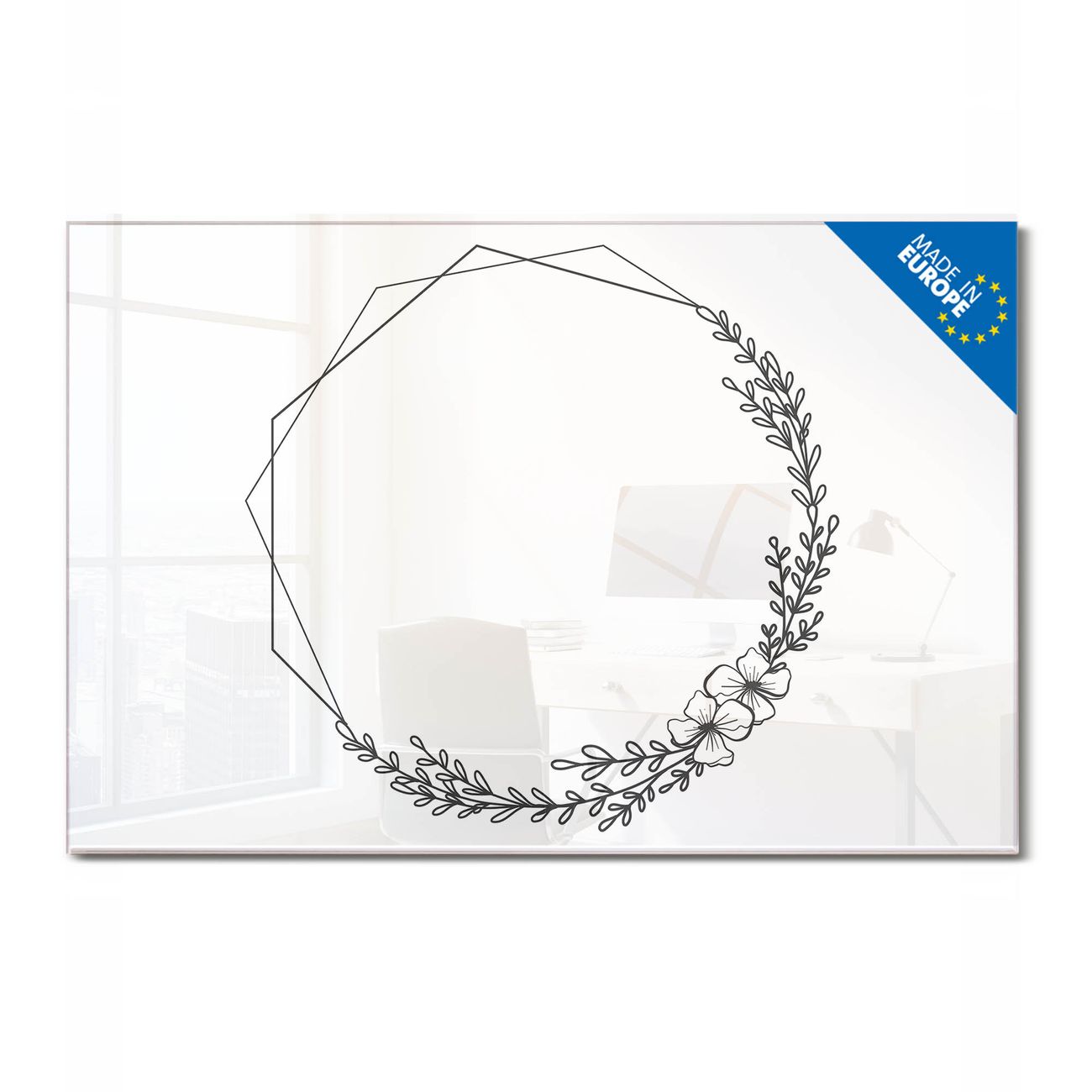 Material: 4mm Sicherheitsglas mit Metallrückwand Eigenschaften: beschreibbar, magnetisch, kratzfest Maße: 120x80x0,6cm, 14,40kg schwer Motiv Nummer 13534 Floral Geometric Frame Zubehör: inklusive 4 Neodym-Magnete