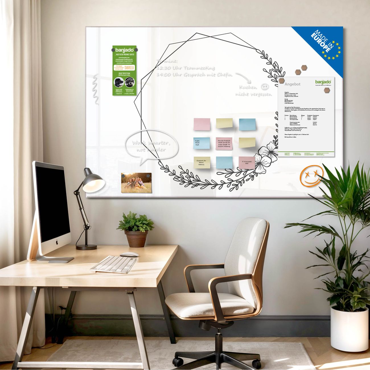 Jede Glas Magnettafel wird in unserer Werkstatt von Hand gefertigt und sorgfältig geprüft. So erhalten Sie ein echtes Qualitätsprodukt, das Funktion und Ästhetik perfekt vereint.?? Warum banjado?