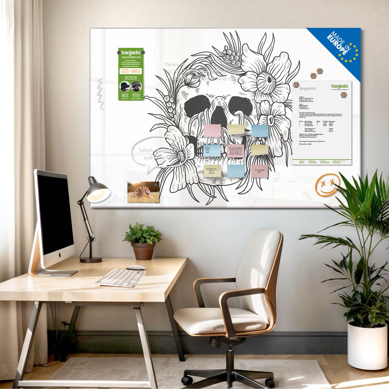 Die banjado Glas Magnettafel mit dem Motiv Motiv Floral Skull 2 verbindet Funktionalität mit Stil. Sie ersetzt das Zettelchaos durch klare Strukturen und bringt dabei eine warme, natürliche Atmosphäre in Ihr Zuhause. Ob im Büro, in der Küche oder im Eingangsbereich - dieses Design-Board zieht Blicke an und sorgt für Ordnung mit Charakter.