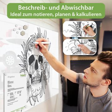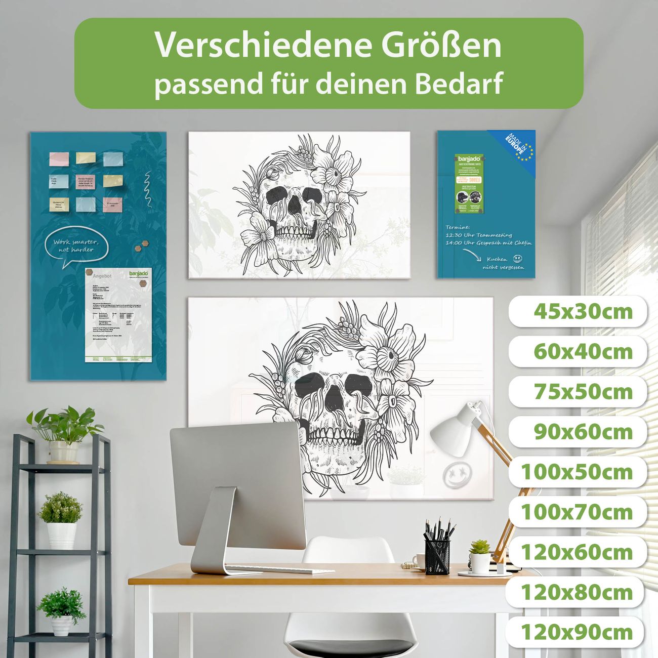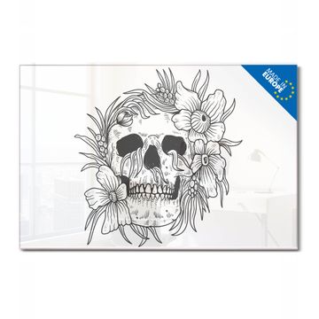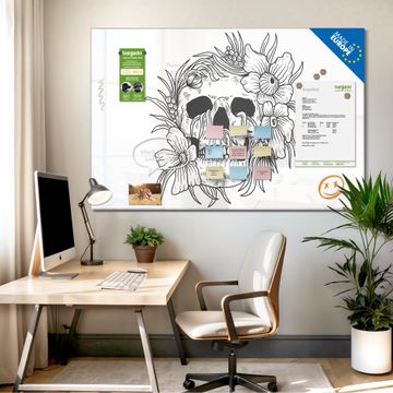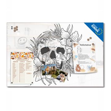 Material: 4mm Sicherheitsglas mit Metallrückwand Eigenschaften: beschreibbar, magnetisch, kratzfest Maße: 45x30x0,6cm, 2,03kg schwer Motiv Nummer 13333 Floral Skull 2 Zubehör: inklusive 4 Neodym-Magnete