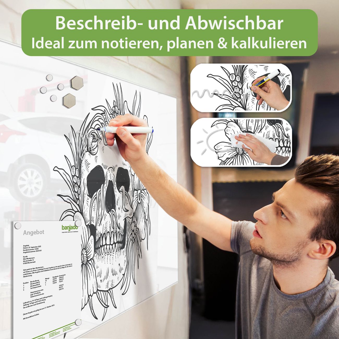 Jede Glas Magnettafel wird in unserer Werkstatt von Hand gefertigt und sorgfältig geprüft. So erhalten Sie ein echtes Qualitätsprodukt, das Funktion und Ästhetik perfekt vereint.?? Warum banjado?