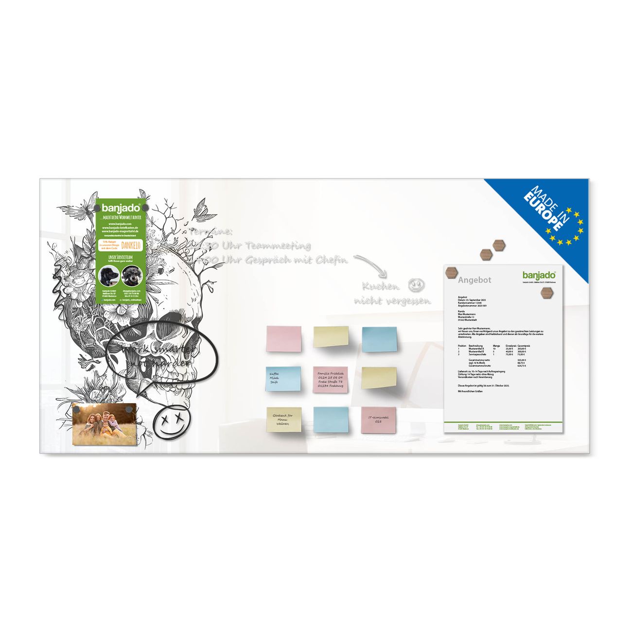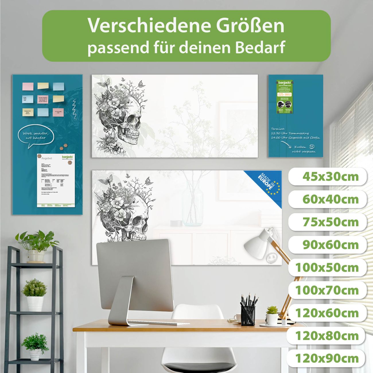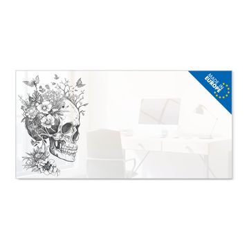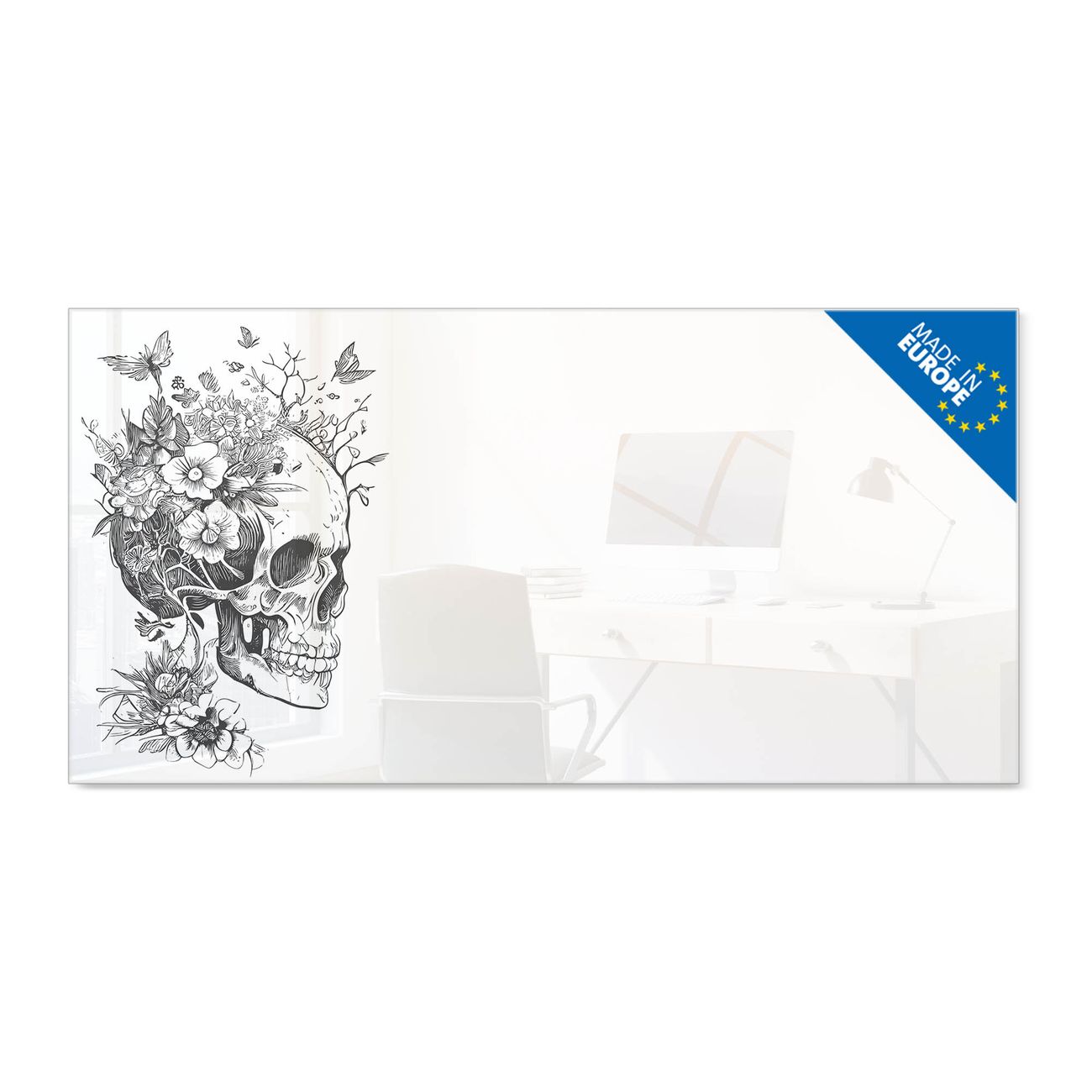 Material: 4mm Sicherheitsglas mit Metallrückwand Eigenschaften: beschreibbar, magnetisch, kratzfest Maße: 100x50x0,6cm, 7,50kg schwer Motiv Nummer 13329 Floral Skull Zubehör: inklusive 4 Neodym-Magnete