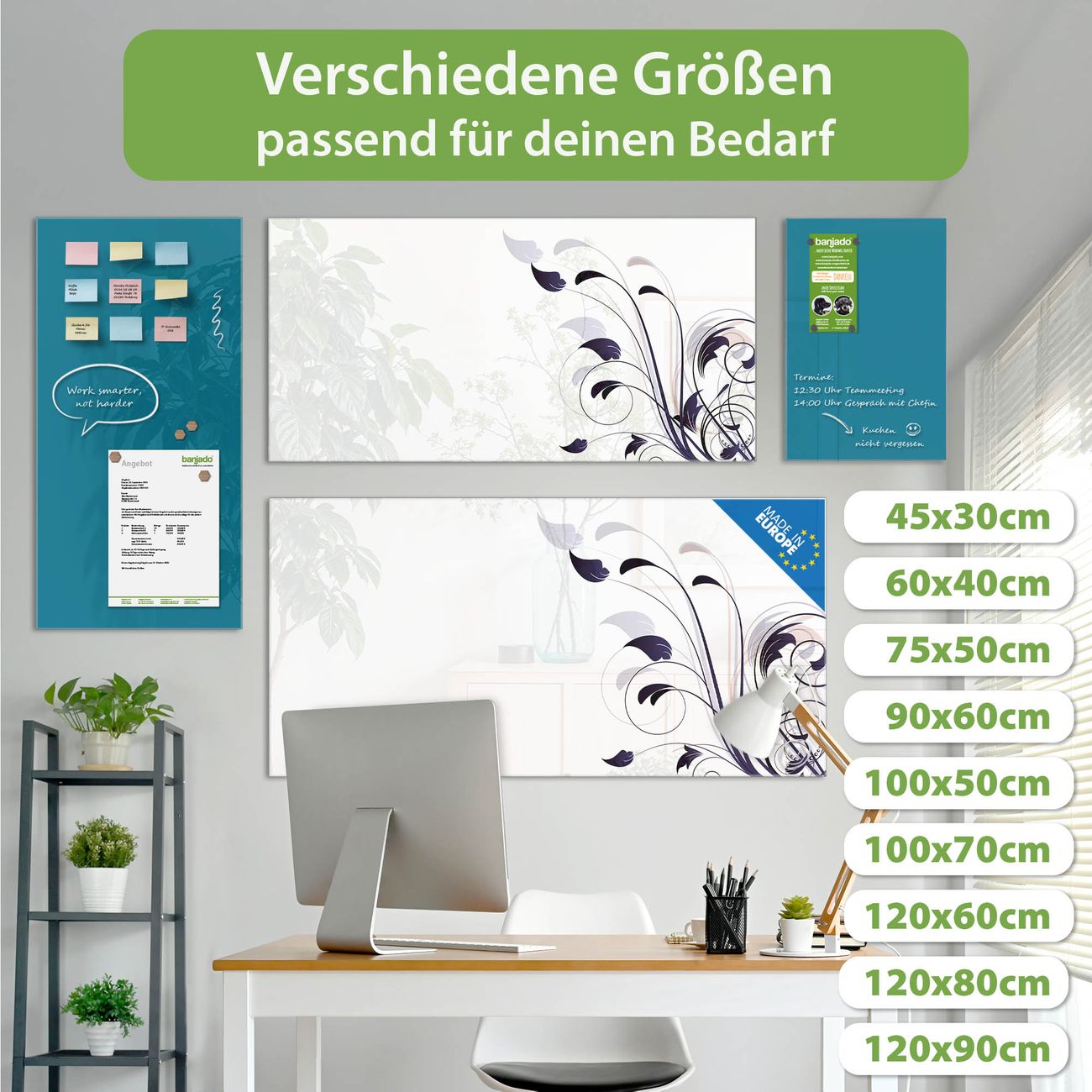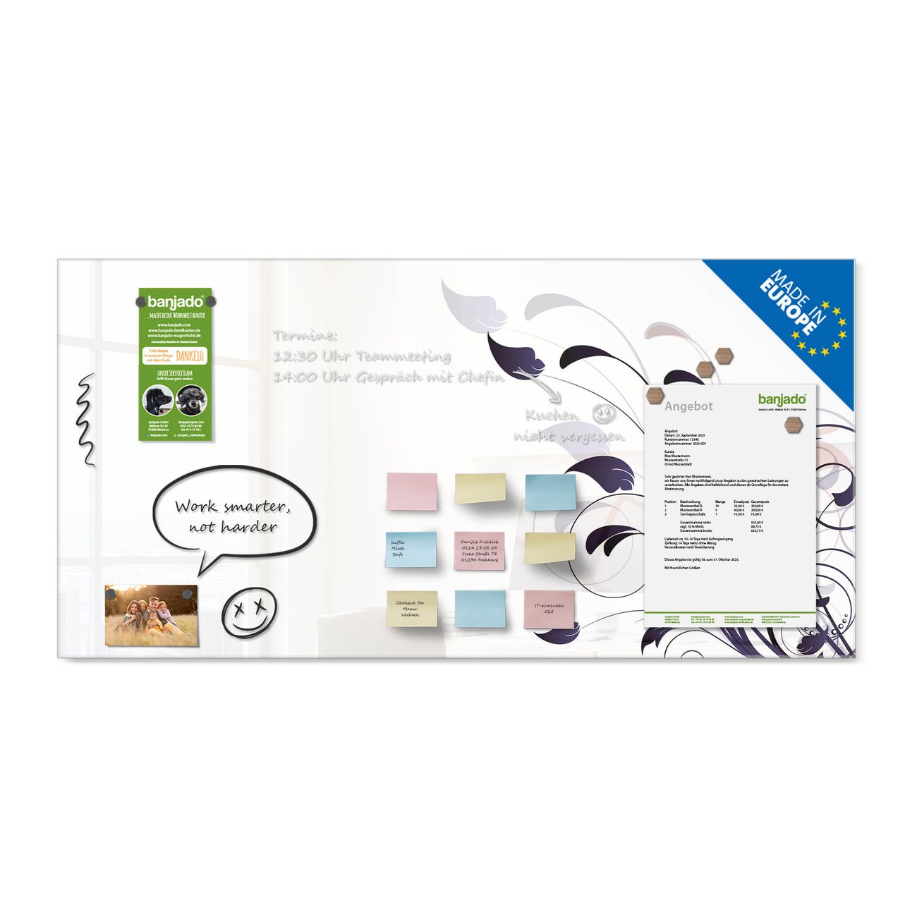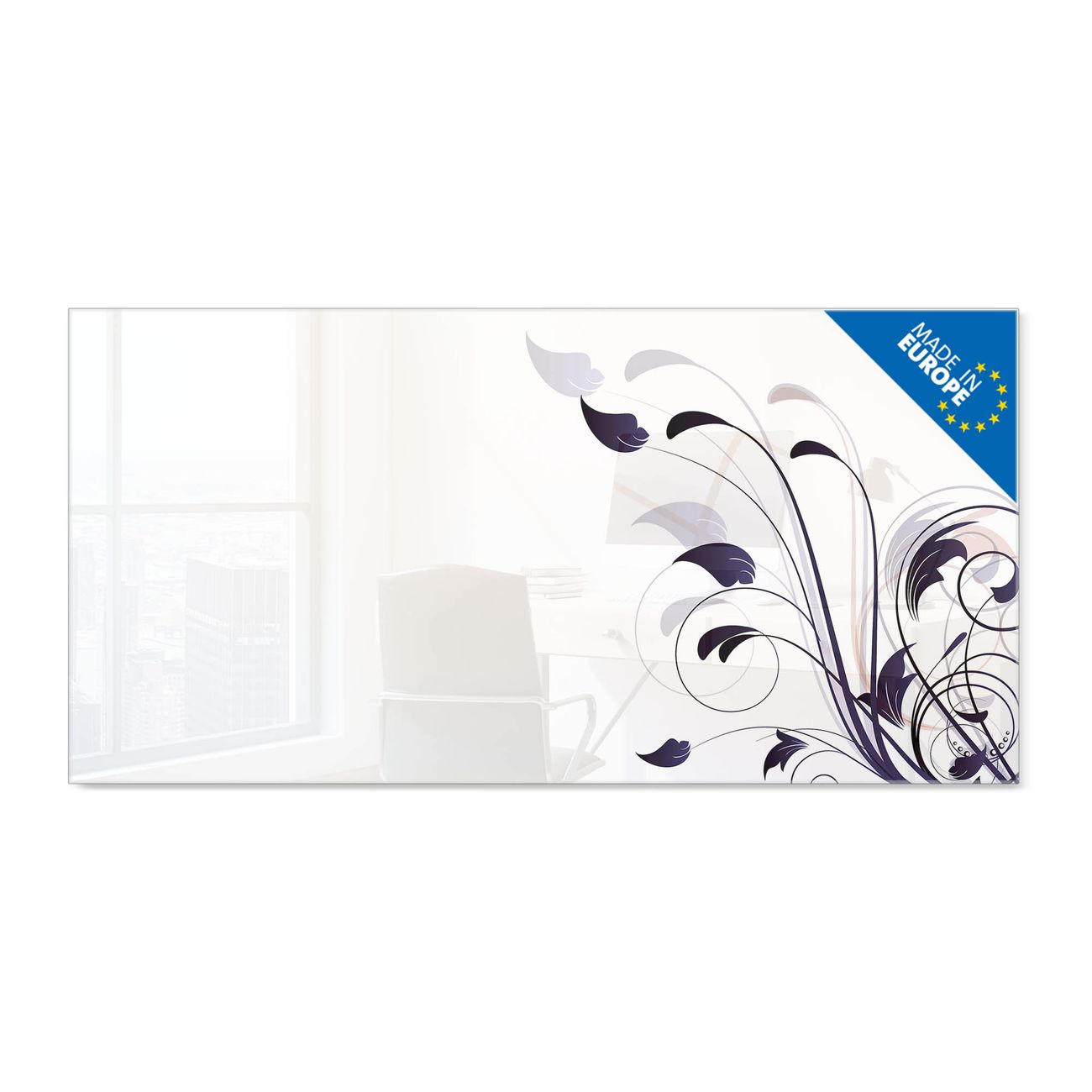 Material: 4mm Sicherheitsglas mit Metallrückwand Eigenschaften: beschreibbar, magnetisch, kratzfest Maße: 100x50x0,6cm, 7,50kg schwer Motiv Nummer 13200 Florale Eleganz Zubehör: inklusive 4 Neodym-Magnete