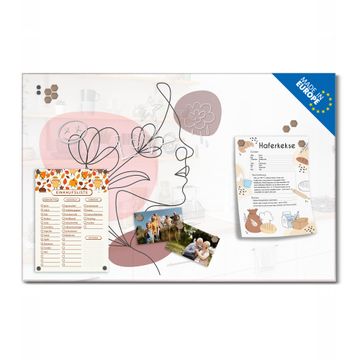 Material: 4mm Sicherheitsglas mit Metallrückwand Eigenschaften: beschreibbar, magnetisch, kratzfest Maße: 75x50x0,6cm, 5,63kg schwer Motiv Nummer 13302 Florale Line Art Zubehör: inklusive 4 Neodym-Magnete