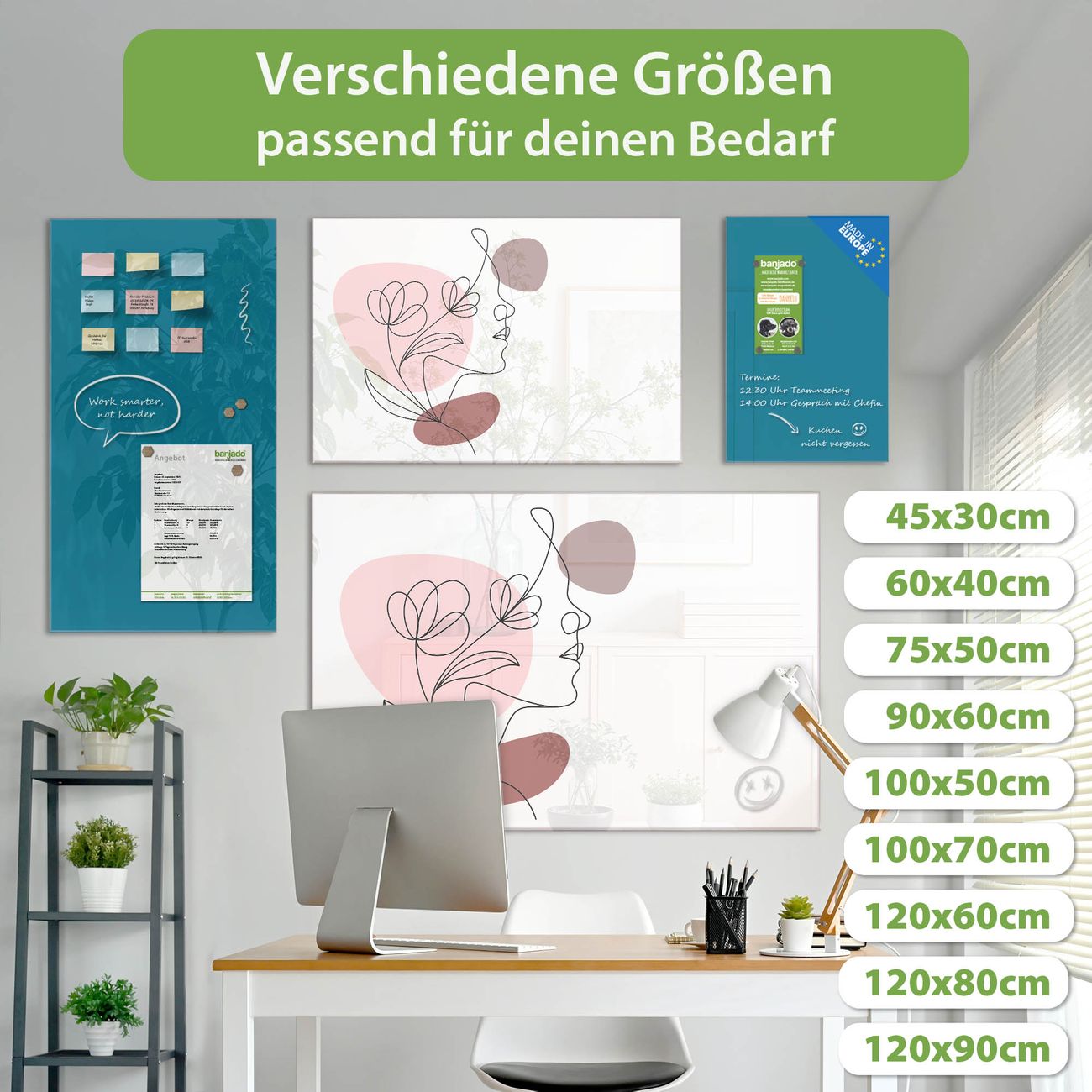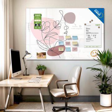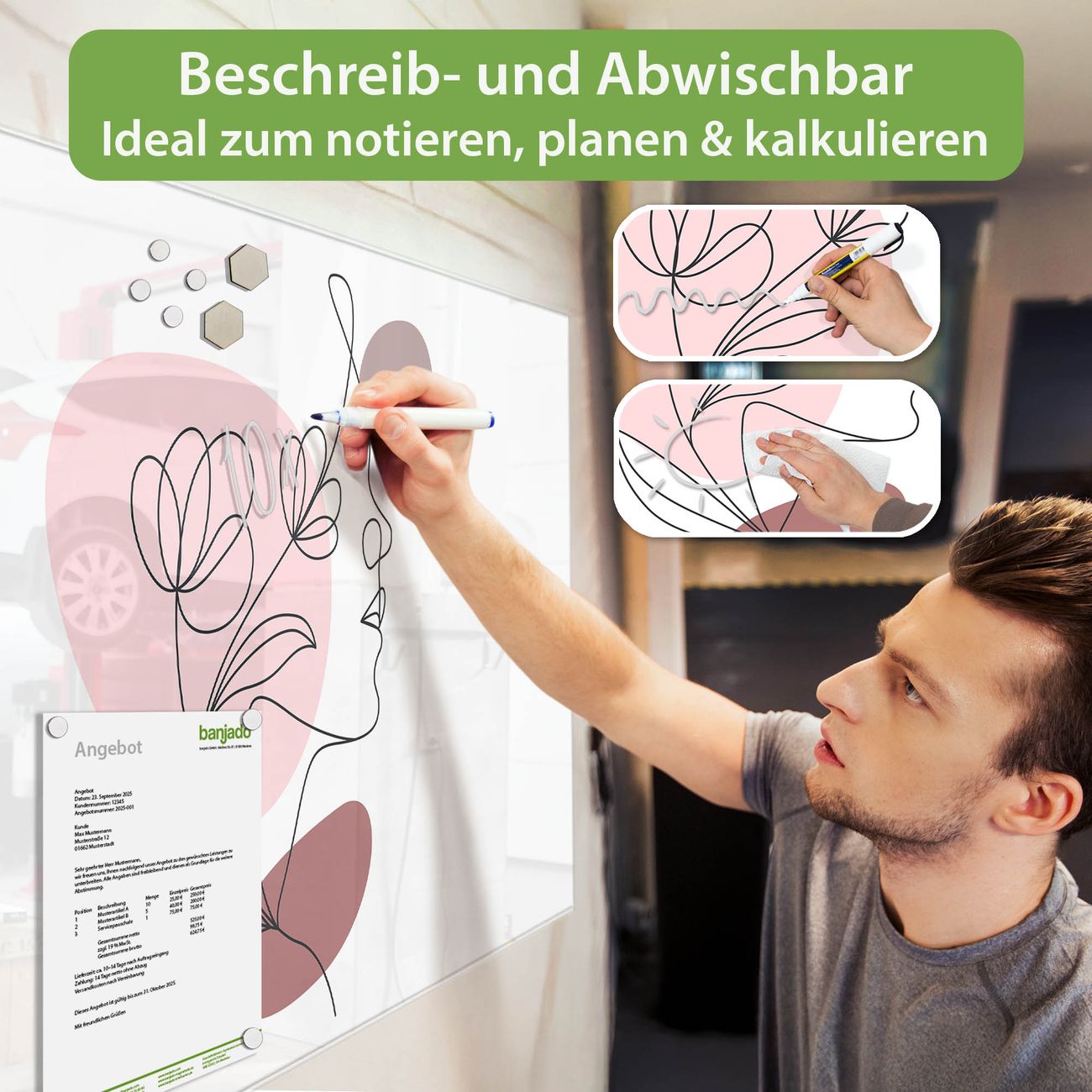 Material: 4mm Sicherheitsglas mit Metallrückwand Eigenschaften: beschreibbar, magnetisch, kratzfest Maße: 120x80x0,6cm, 14,40kg schwer Motiv Nummer 13302 Florale Line Art Zubehör: inklusive 4 Neodym-Magnete
