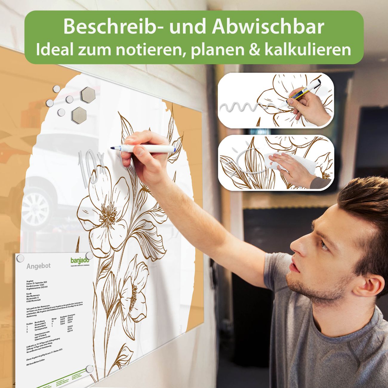 Die banjado Glas Magnettafel mit dem Motiv Motiv Florale Skizze verbindet Funktionalität mit Stil. Sie ersetzt das Zettelchaos durch klare Strukturen und bringt dabei eine warme, natürliche Atmosphäre in Ihr Zuhause. Ob im Büro, in der Küche oder im Eingangsbereich - dieses Design-Board zieht Blicke an und sorgt für Ordnung mit Charakter.