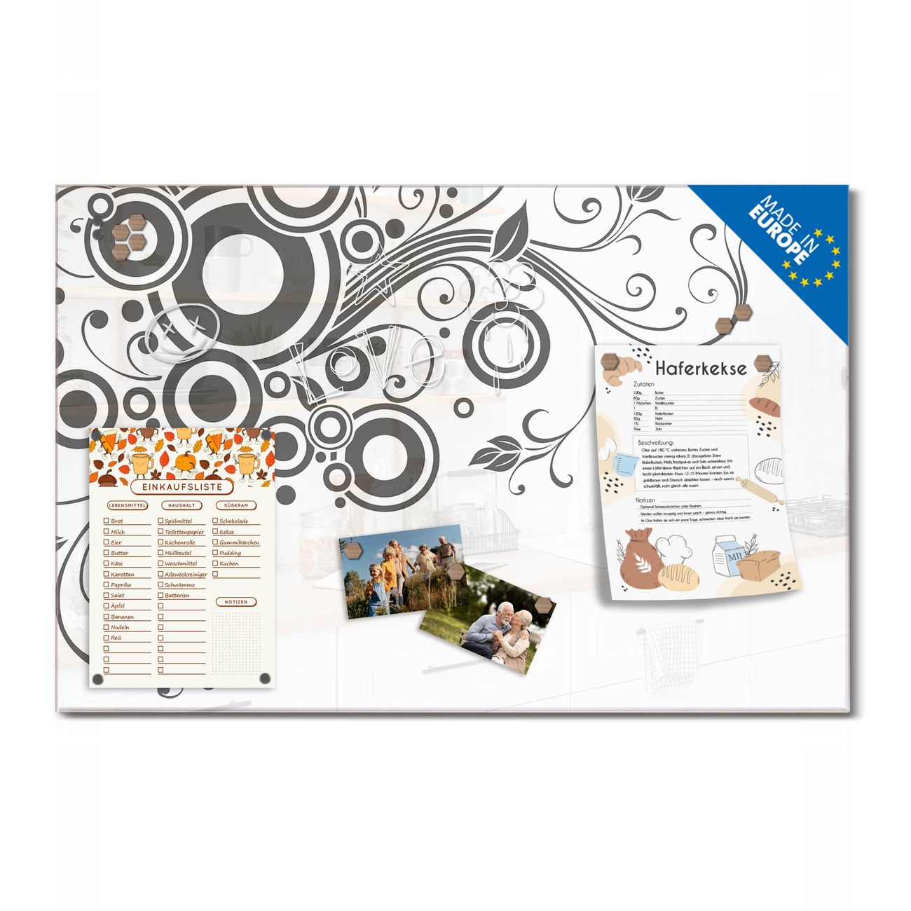 Ein Stück Design, das Ihren Alltag organisiert. Schreiben, heften, inspirieren - alles an einem Ort. Qualität, die man spürt. Montage leicht gemacht. Handwerk mit Herz - veredelt in Sachsen. Einzigartiges Design mit Motiv Motiv Florale Swirls Beschreibbare Glasoberfläche, leicht zu reinigen Starke Magnetkraft durch Stahlrückwand Inklusive 4 Neodym-Magneten Flexible Montageoptionen Handveredelt in Sachsen - Qualität, die bleibt
