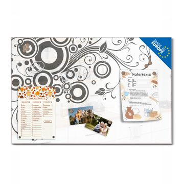 Material: 4mm Sicherheitsglas mit Metallrückwand Eigenschaften: beschreibbar, magnetisch, kratzfest Maße: 75x50x0,6cm, 5,63kg schwer Motiv Nummer 13222 Florale Swirls Zubehör: inklusive 4 Neodym-Magnete