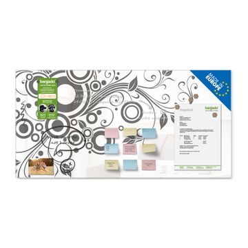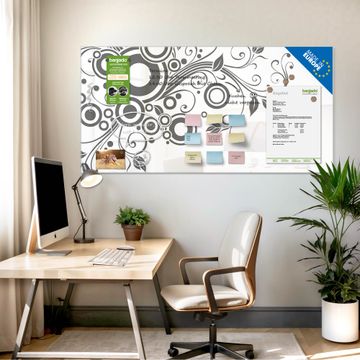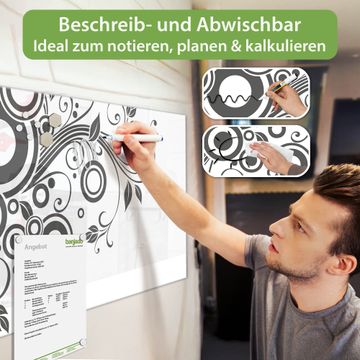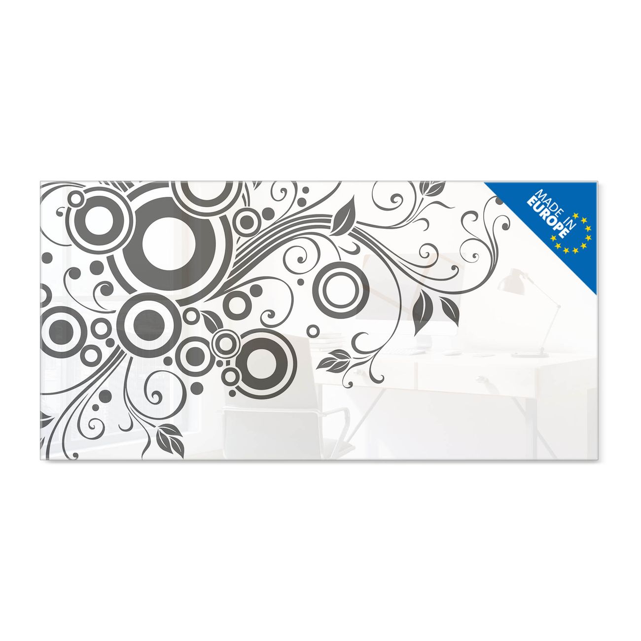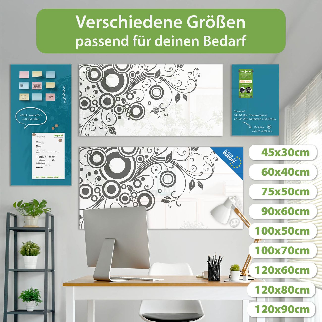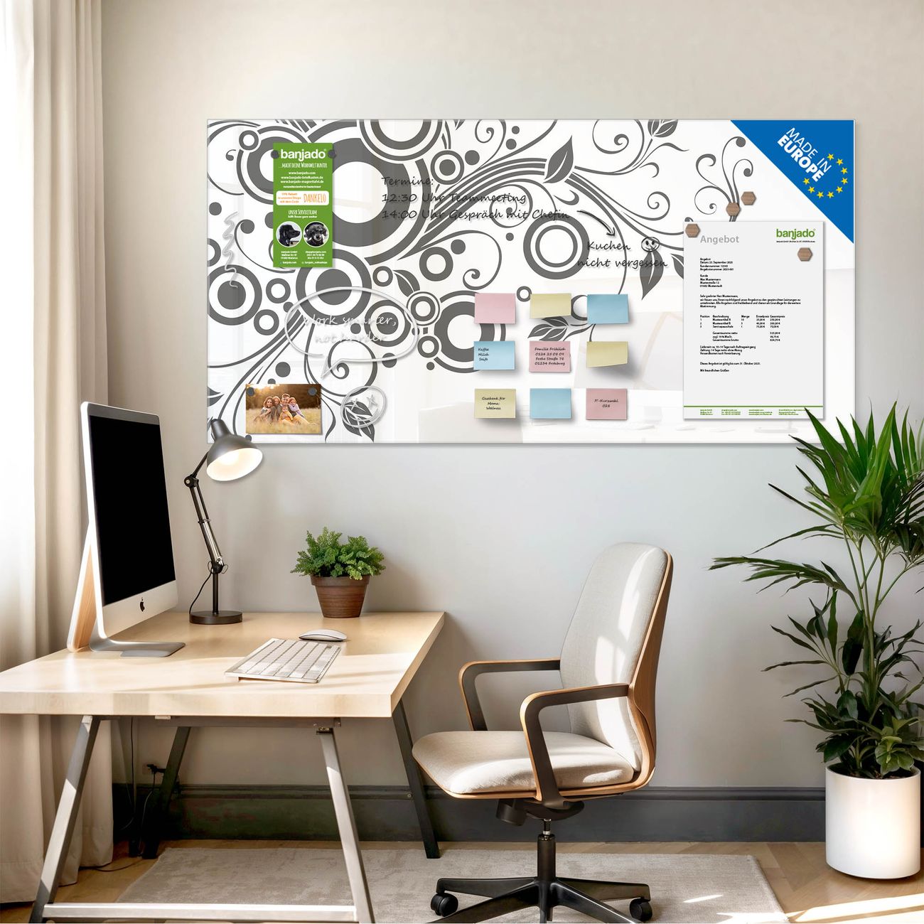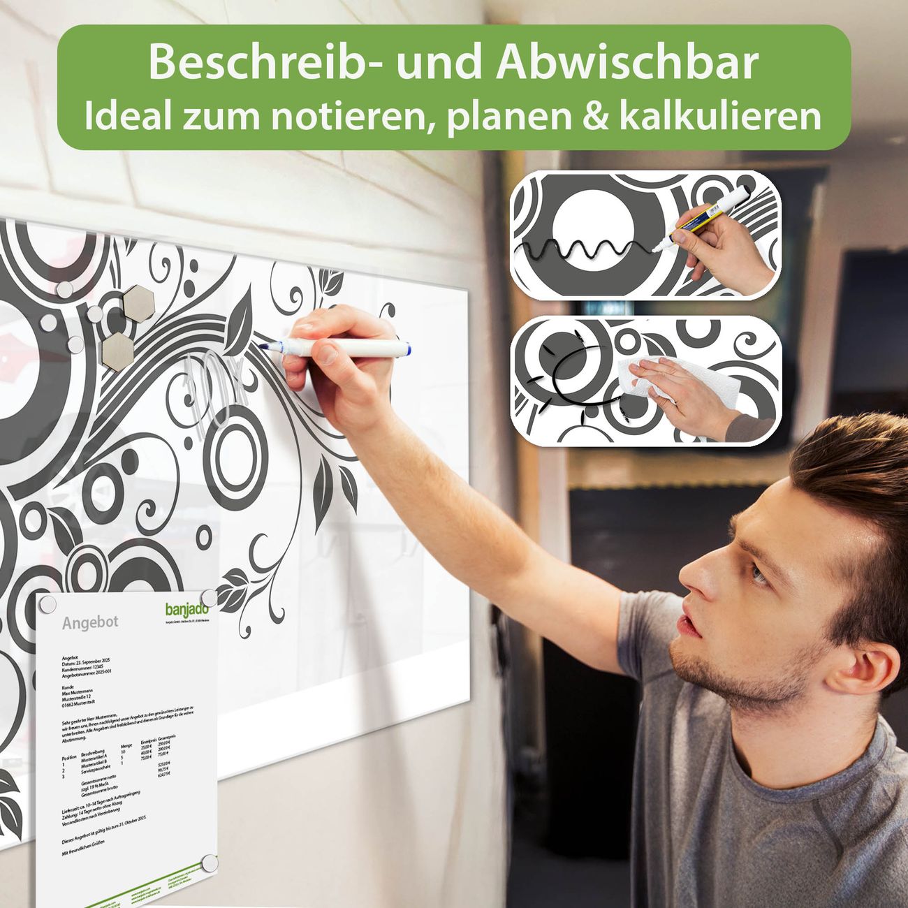 Material: 4mm Sicherheitsglas mit Metallrückwand Eigenschaften: beschreibbar, magnetisch, kratzfest Maße: 100x50x0,6cm, 7,50kg schwer Motiv Nummer 13222 Florale Swirls Zubehör: inklusive 4 Neodym-Magnete