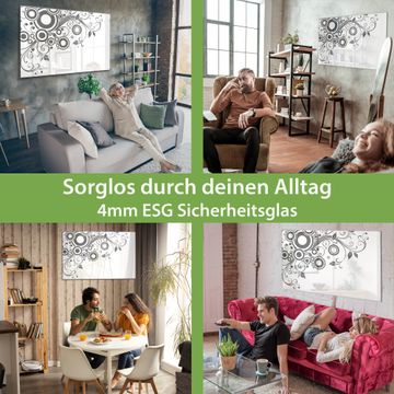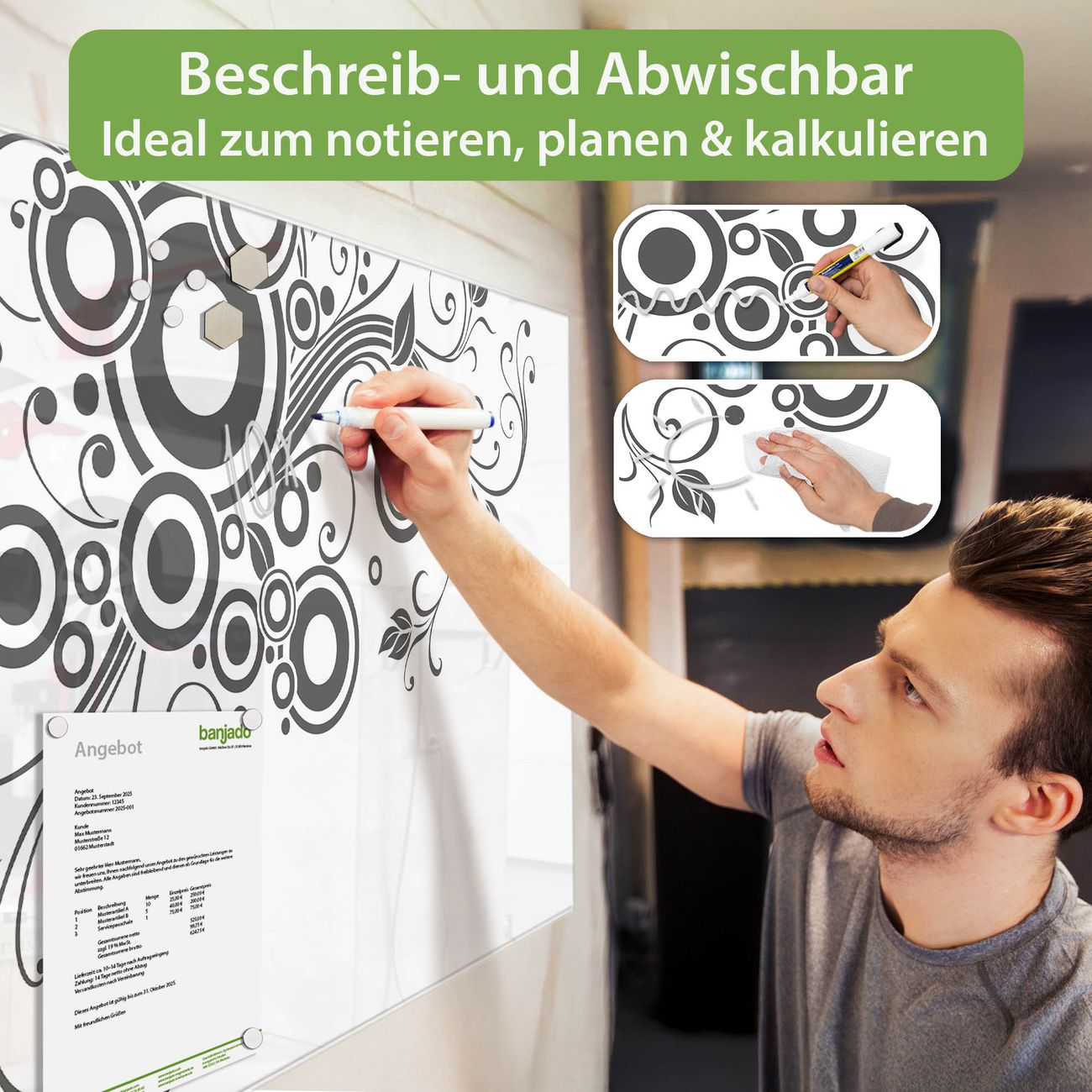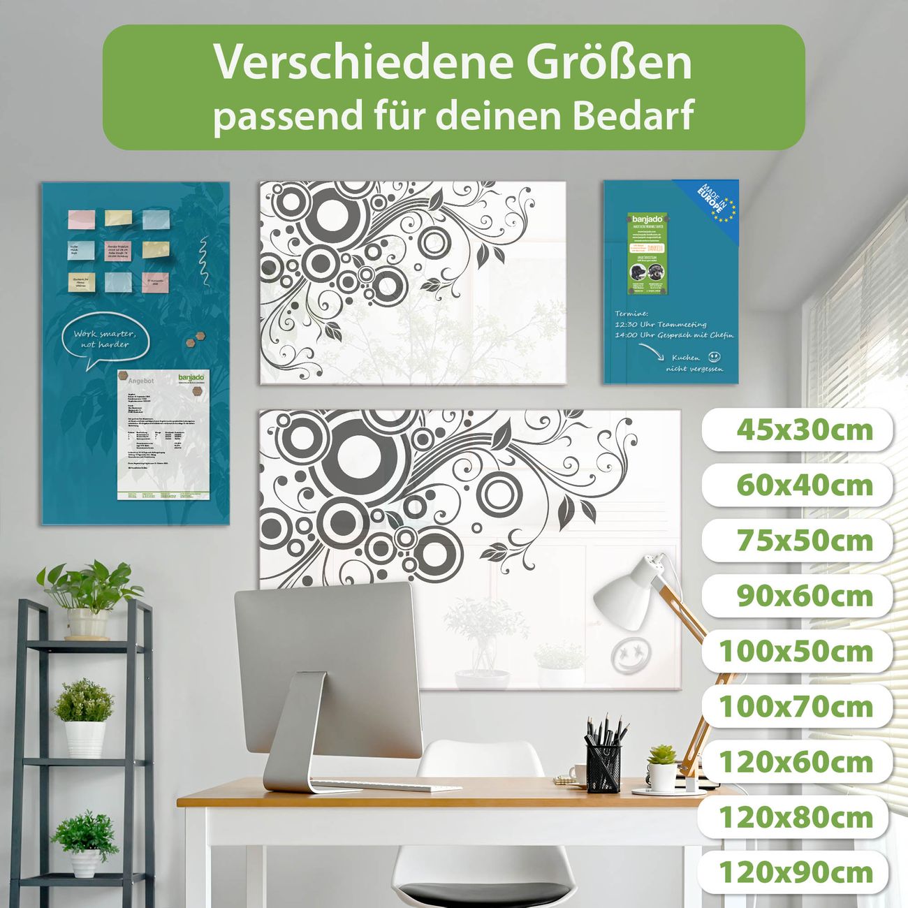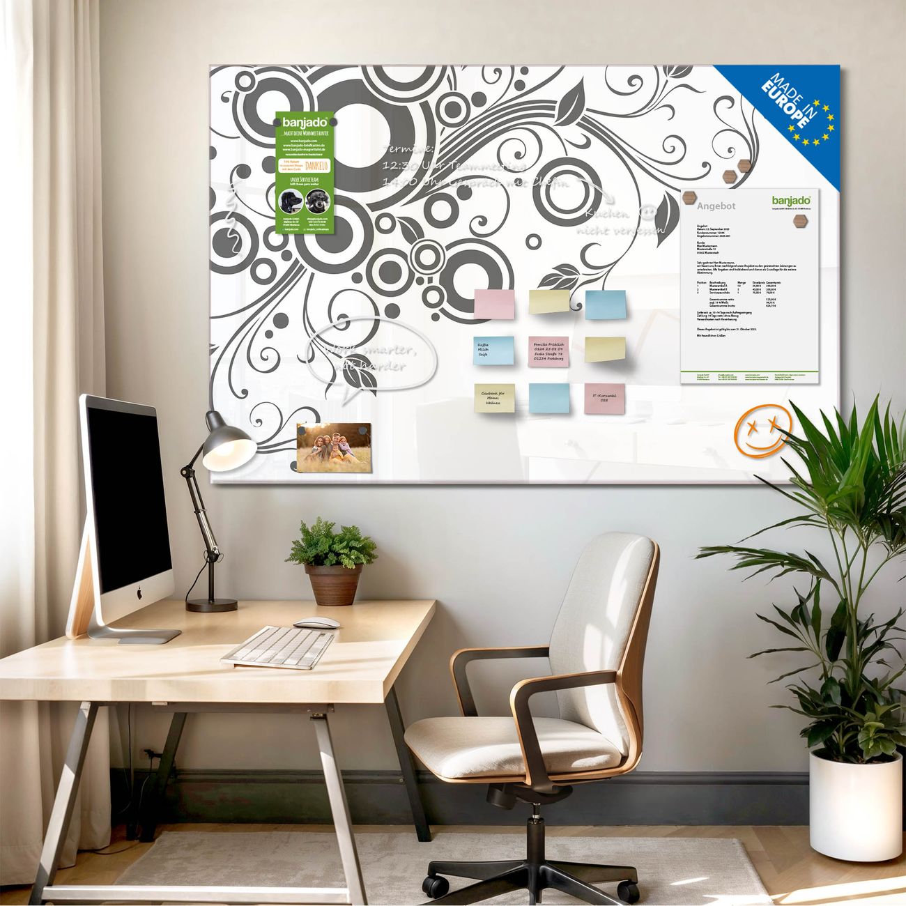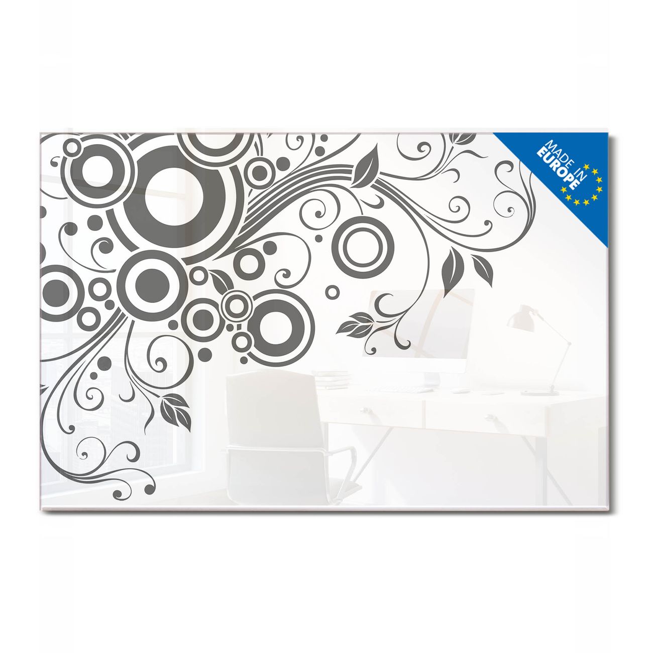 Material: 4mm Sicherheitsglas mit Metallrückwand Eigenschaften: beschreibbar, magnetisch, kratzfest Maße: 120x80x0,6cm, 14,40kg schwer Motiv Nummer 13222 Florale Swirls Zubehör: inklusive 4 Neodym-Magnete