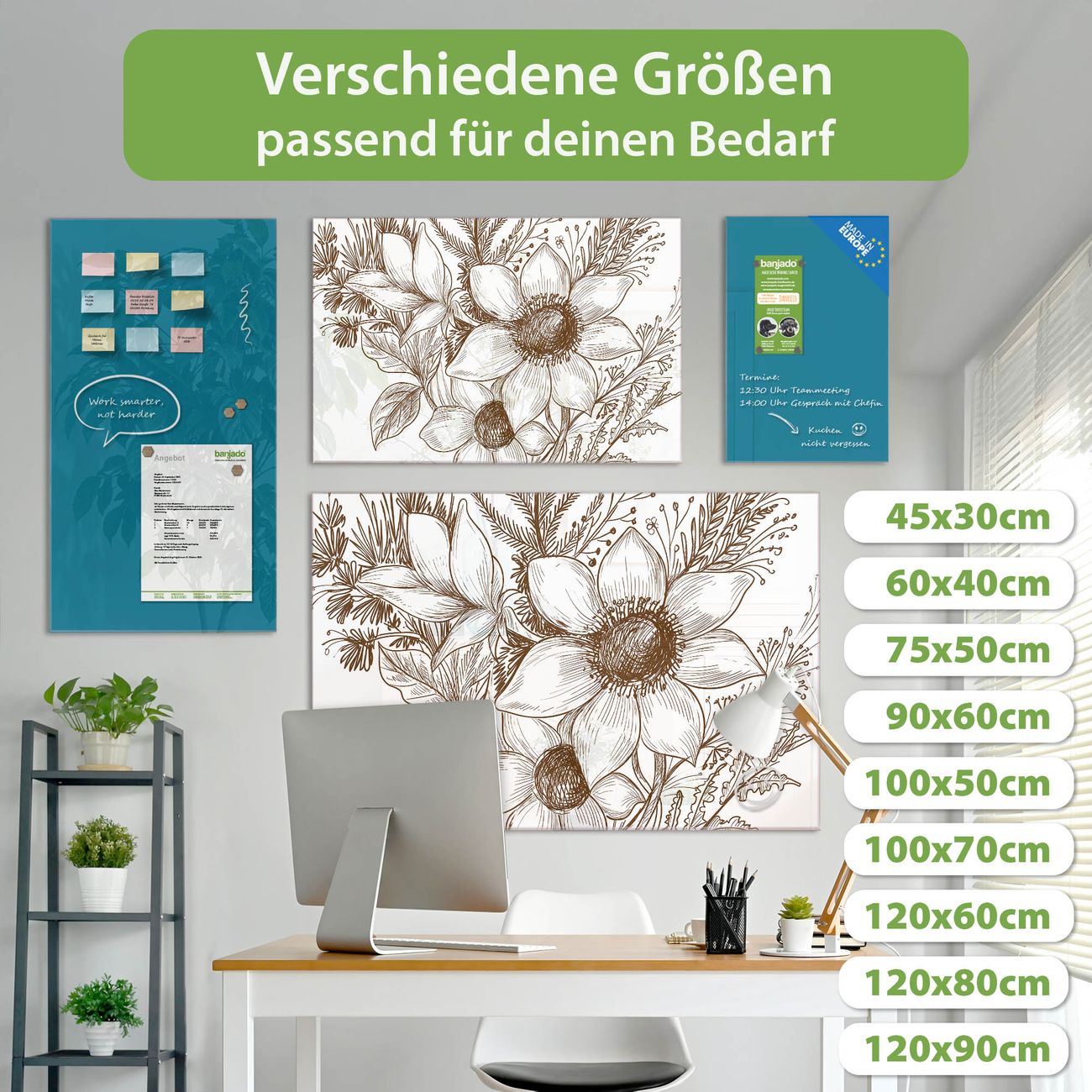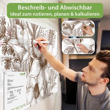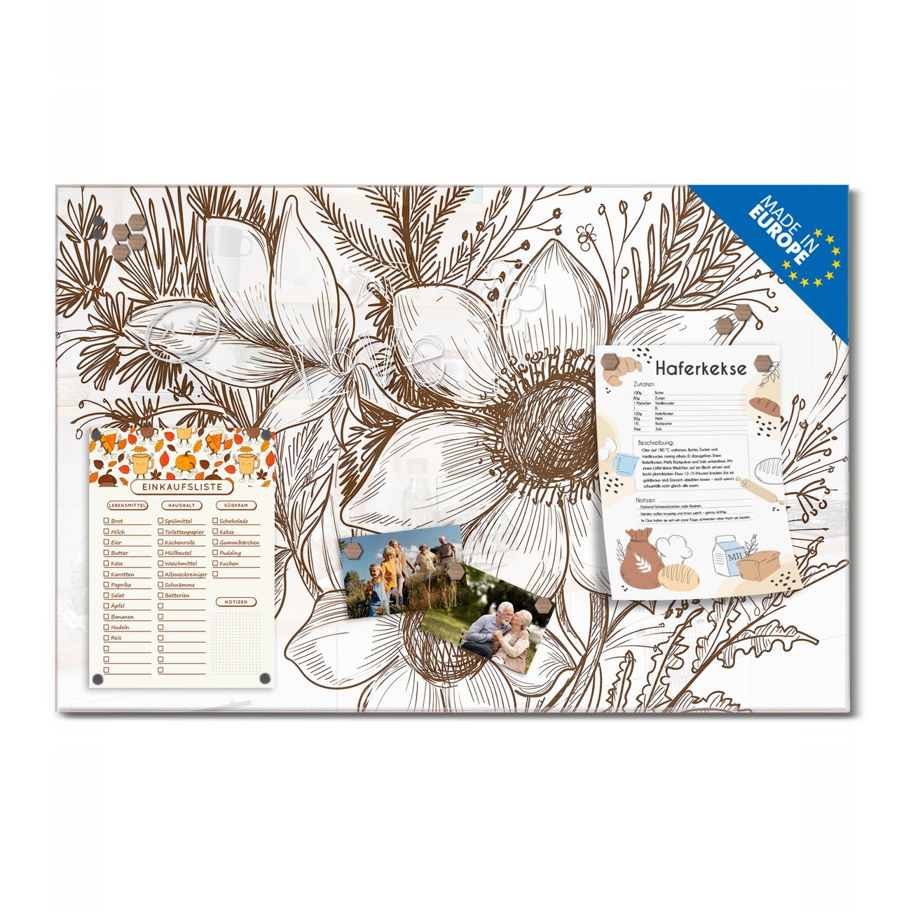 Material: 4mm Sicherheitsglas mit Metallrückwand Eigenschaften: beschreibbar, magnetisch, kratzfest Maße: 75x50x0,6cm, 5,63kg schwer Motiv Nummer 13238 Florale Zeichnung Zubehör: inklusive 4 Neodym-Magnete