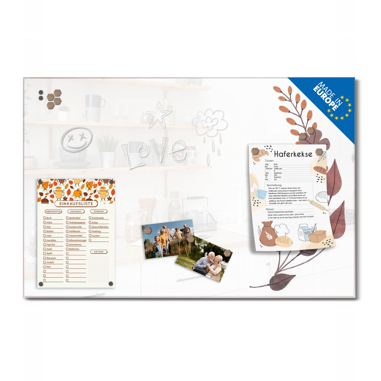 Auf der glatten Glasoberfläche lassen sich Termine, Rezepte oder Notizen ganz einfach mit Kreidestiften festhalten und rückstandslos entfernen. Starke Neodym-Magnete halten Ihre wichtigsten Erinnerungen sicher an Ort und Stelle. So entsteht Ihre ganz persönliche Ideenwand - jeden Tag neu.