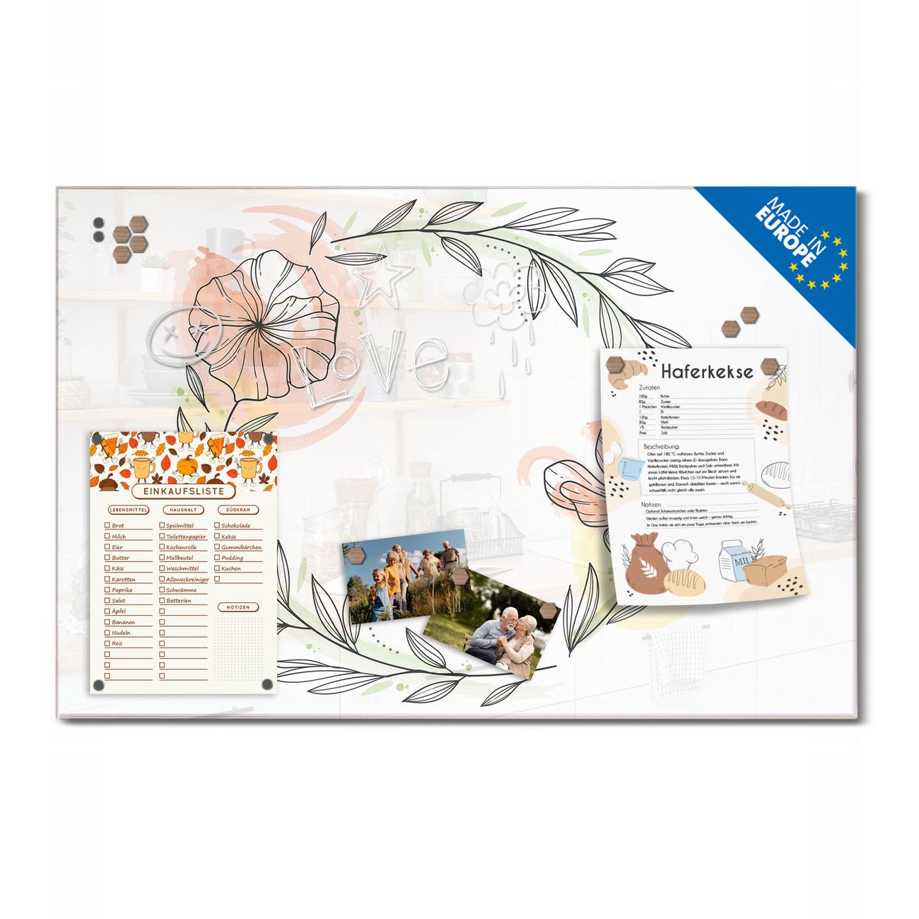 Material: 4mm Sicherheitsglas mit Metallrückwand Eigenschaften: beschreibbar, magnetisch, kratzfest Maße: 75x50x0,6cm, 5,63kg schwer Motiv Nummer 13521 Floraler Blütenkranz Zubehör: inklusive 4 Neodym-Magnete