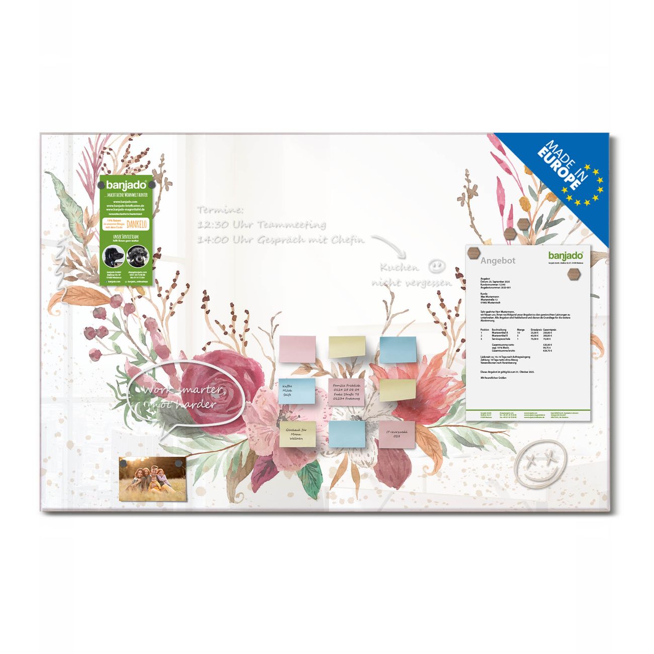 Ein Stück Design, das Ihren Alltag organisiert. Schreiben, heften, inspirieren - alles an einem Ort. Qualität, die man spürt. Montage leicht gemacht. Handwerk mit Herz - veredelt in Sachsen. Einzigartiges Design mit Motiv Motiv Floraler Blumenkranz Beschreibbare Glasoberfläche, leicht zu reinigen Starke Magnetkraft durch Stahlrückwand Inklusive 4 Neodym-Magneten Flexible Montageoptionen Handveredelt in Sachsen - Qualität, die bleibt