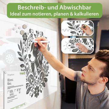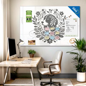 Material: 4mm Sicherheitsglas mit Metallrückwand Eigenschaften: beschreibbar, magnetisch, kratzfest Maße: 75x50x0,6cm, 5,63kg schwer Motiv Nummer 13410 Floraler Hund Zubehör: inklusive 4 Neodym-Magnete