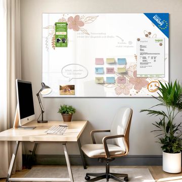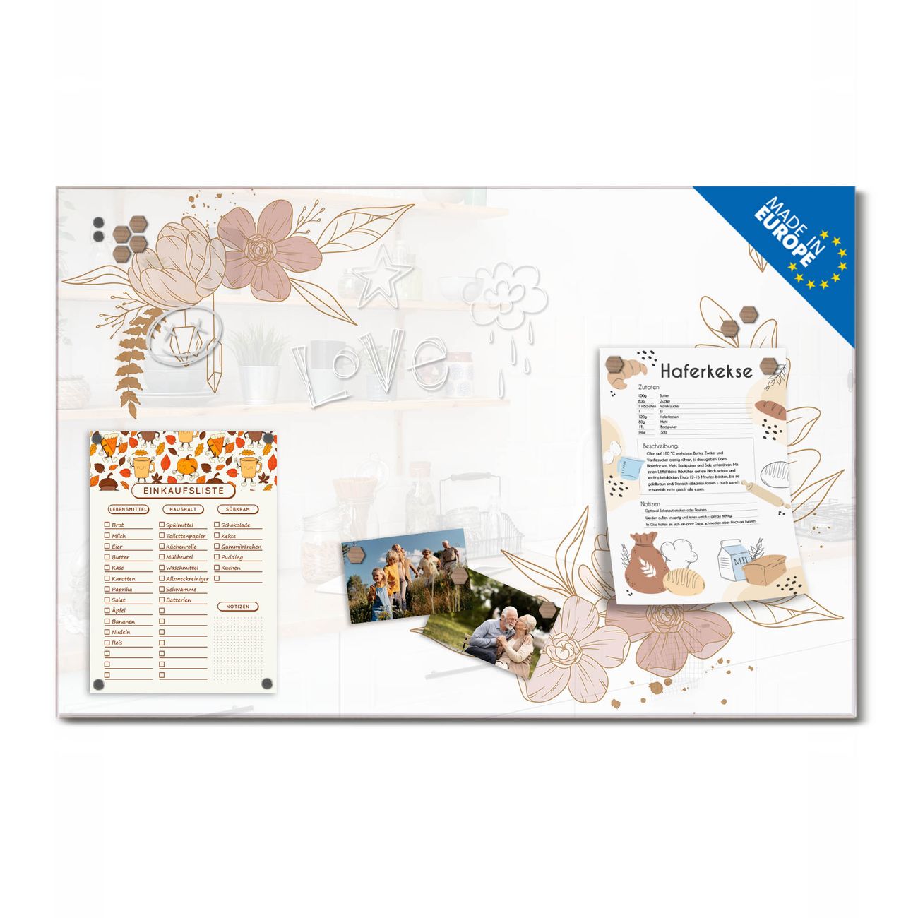 Material: 4mm Sicherheitsglas mit Metallrückwand Eigenschaften: beschreibbar, magnetisch, kratzfest Maße: 75x50x0,6cm, 5,63kg schwer Motiv Nummer 13519 Floraler Kranz Zubehör: inklusive 4 Neodym-Magnete