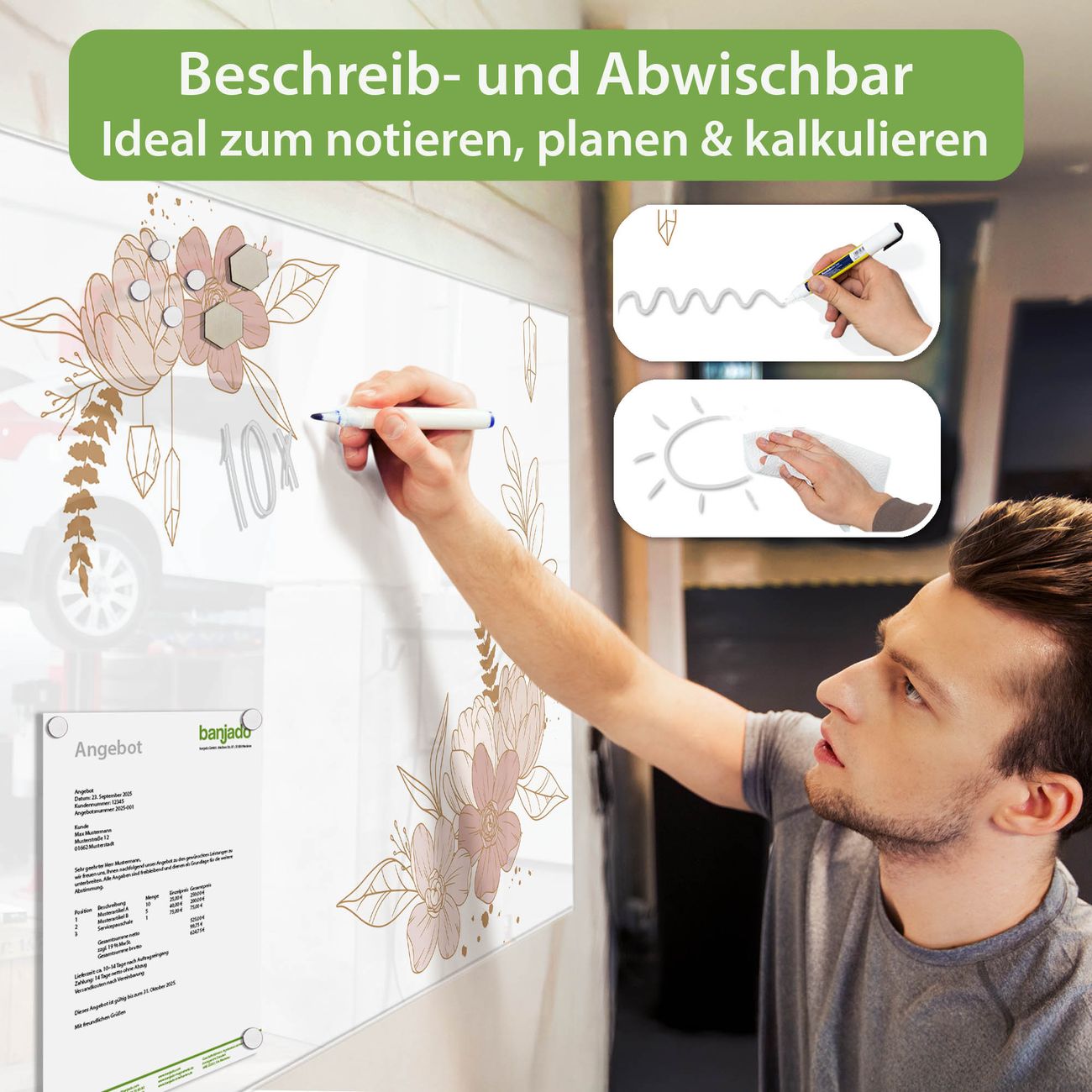 Die banjado Glas Magnettafel mit dem Motiv Motiv Floraler Kranz verbindet Funktionalität mit Stil. Sie ersetzt das Zettelchaos durch klare Strukturen und bringt dabei eine warme, natürliche Atmosphäre in Ihr Zuhause. Ob im Büro, in der Küche oder im Eingangsbereich - dieses Design-Board zieht Blicke an und sorgt für Ordnung mit Charakter.