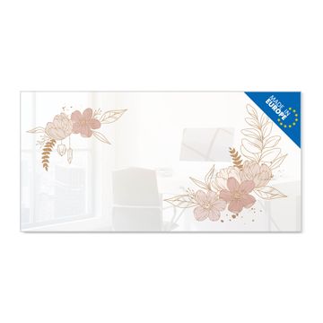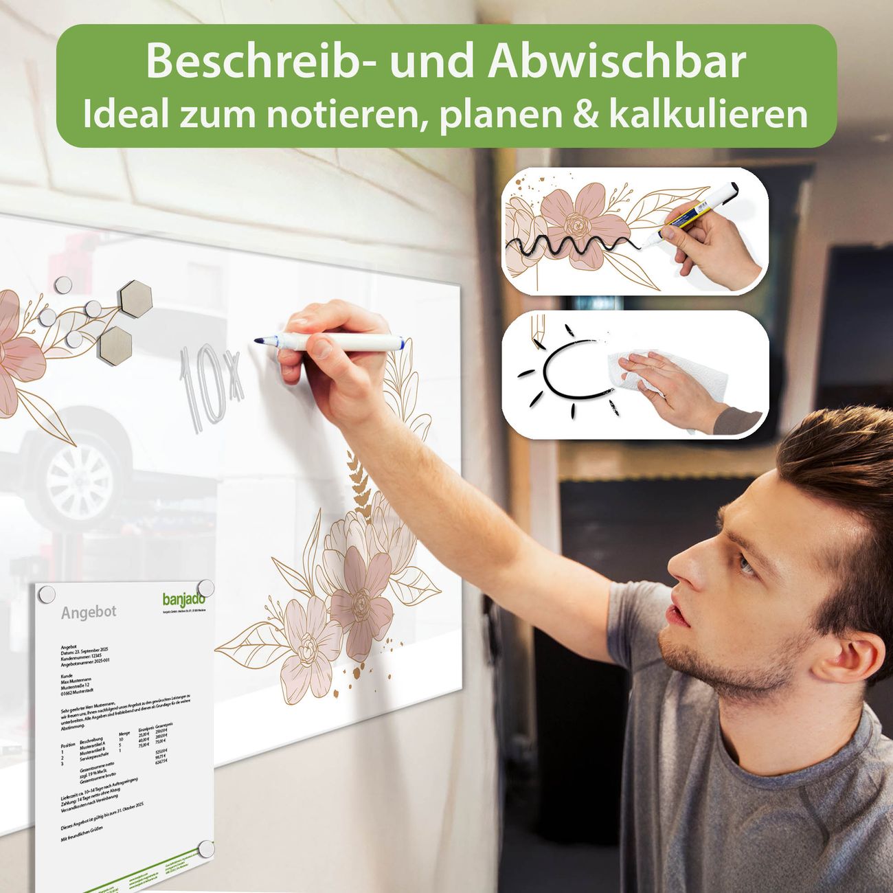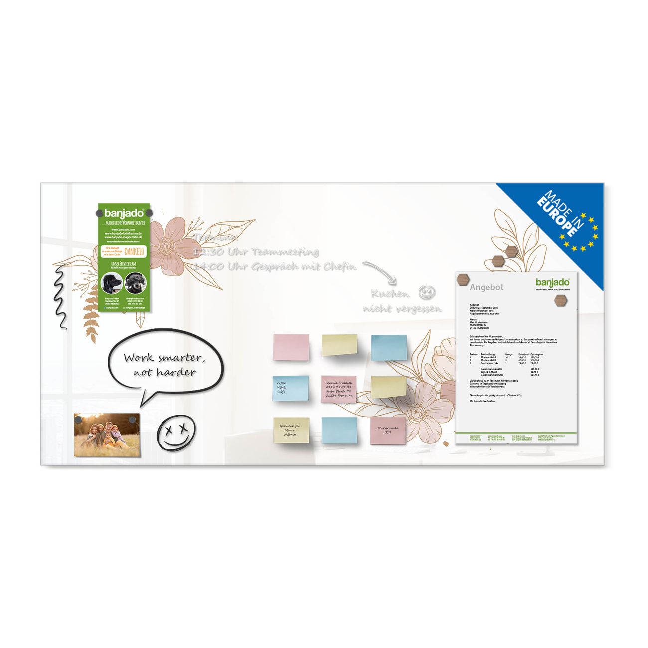Material: 4mm Sicherheitsglas mit Metallrückwand Eigenschaften: beschreibbar, magnetisch, kratzfest Maße: 100x50x0,6cm, 7,50kg schwer Motiv Nummer 13519 Floraler Kranz Zubehör: inklusive 4 Neodym-Magnete