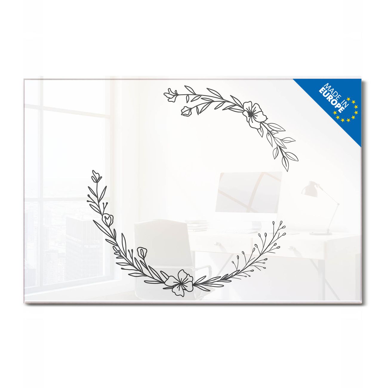 Material: 4mm Sicherheitsglas mit Metallrückwand Eigenschaften: beschreibbar, magnetisch, kratzfest Maße: 75x50x0,6cm, 5,63kg schwer Motiv Nummer 13536 Floraler Linienkranz Zubehör: inklusive 4 Neodym-Magnete