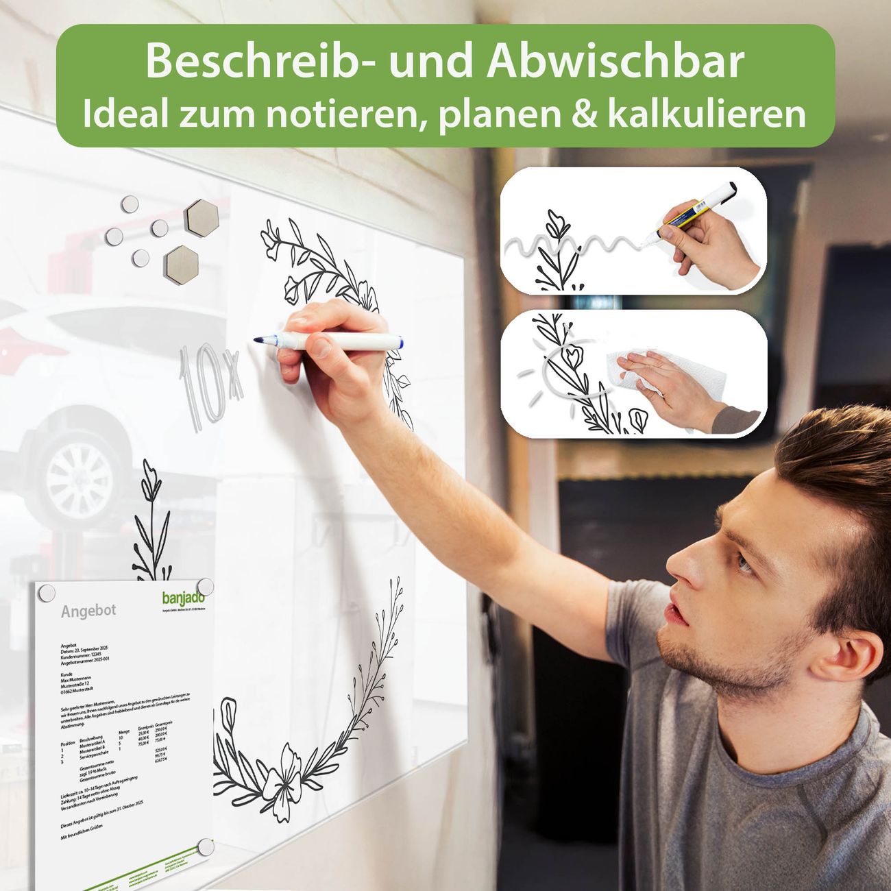 Jede Glas Magnettafel wird in unserer Werkstatt von Hand gefertigt und sorgfältig geprüft. So erhalten Sie ein echtes Qualitätsprodukt, das Funktion und Ästhetik perfekt vereint.?? Warum banjado?